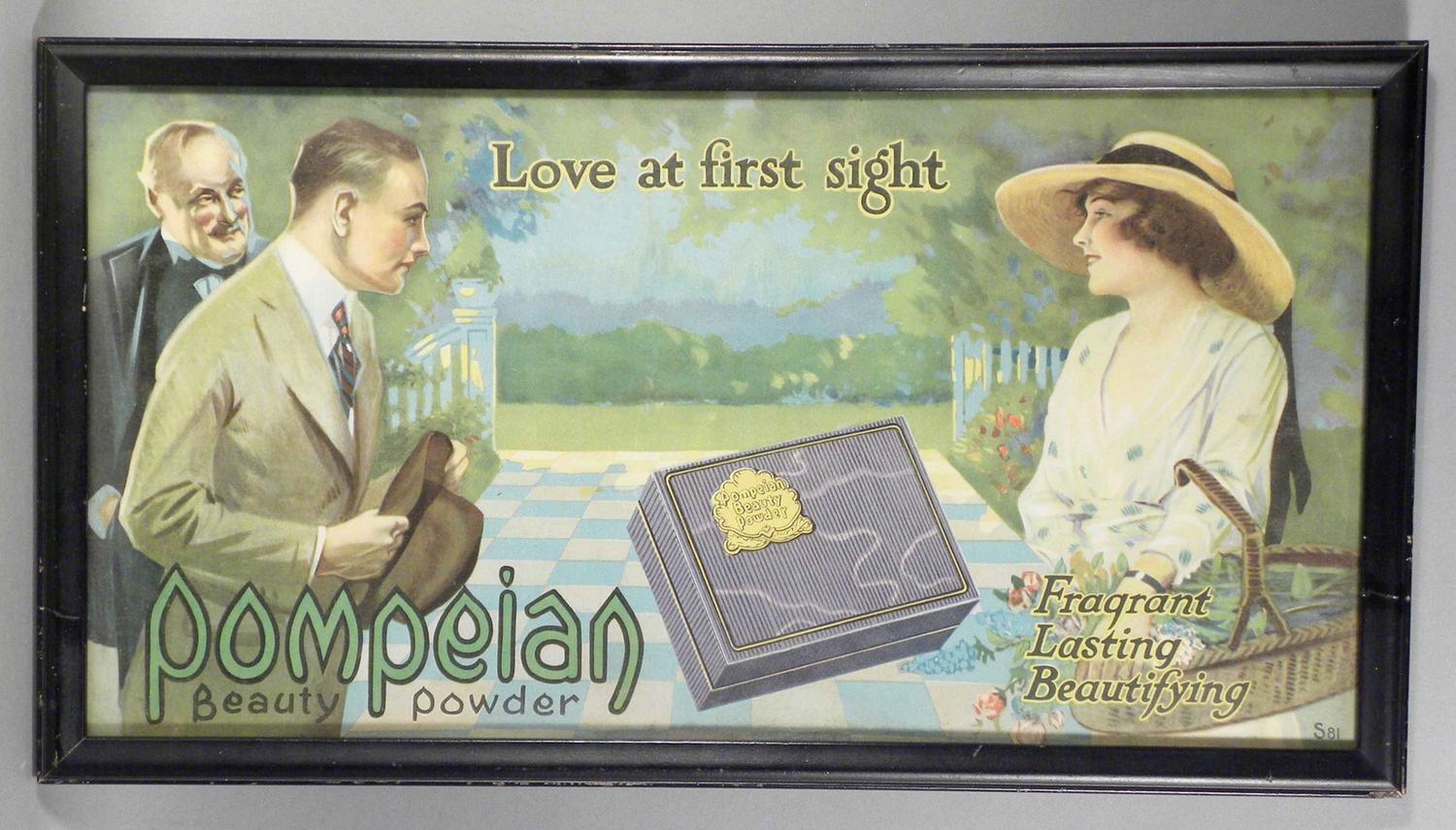 Pompeian Beauty Powder Paper Sign. Entitled, "Love at first sight". Framed under glass. Excellent condition. 22 X 12 inches overall. Starting bid $50