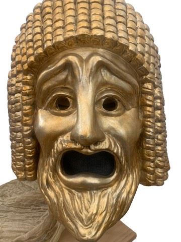 Pompeii (2014) - Painted gold mask. Worn by one of the announcers at the gladiatorial arena. The masks is elaborate and ornate, with an intricate design and delicate filigree work. The masks were used in the film to convey a sense of authority and importance, and they also serve to protect the announcers' identities, as they are often called upon to announce the deaths of gladiators ( 20"x 12"x 12").