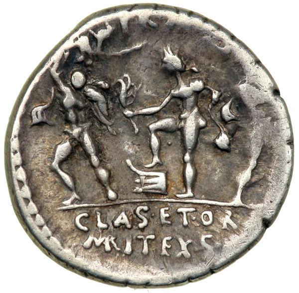 Pompey the Great, d. 48 BC. AR Denarius struck posthumously in Sicily, perhaps at Catana, by Sextus Pompey, one of his sons, 42-40 BC. Head right of Pompey the Great between capis and lituus. Reverse: Neptune standing left, foot on prow, between the brothers Anapias and Amphinomus, with their parents on their shoulders. Cr. 511/3a; Syd. 1344. Very well-disguised banker's mark ("T") on upper obverse neck, which is common for this period. Nicely toned, with an excellent portrait. Choice Very Fine. .