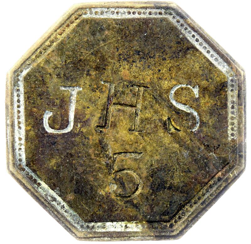 Obverse: J H S 5; Reverse: blank. Fair condition. Possibly J.H. Sherbourne, Ponca Agency.
