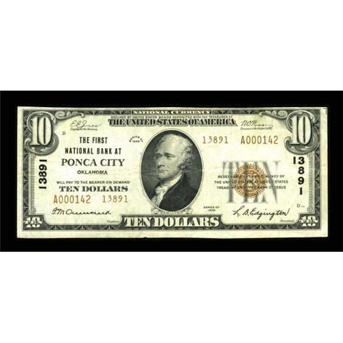 <B>Ponca City, OK</B></I> - $10 1929 Ty. 2 <B>The First NB</B></I> Ch. # 13891<BR> A pleasing example that offers bright paper and solid embossing. <B>Very Fine+.</B></I><BR><BR><b>Shipping:</b> Coins & Currency (<a target="_blank" href="http://www.heritageauctions.com/common/shipping.php">view shipping information</a>)
