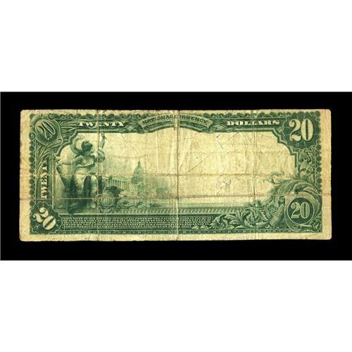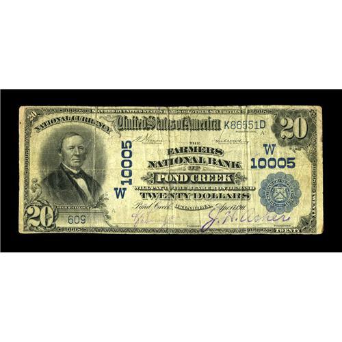 <B>Pond Creek, OK</B></I> - $20 1902 Plain Back Fr. 653 <B>The Farmers NB</B></I> Ch. # (W)10005<BR>This is an excessively rare note from a bank which has never previously been offered for sale in large size. Two examples are known with this title, and one with the other, with both of the other known examples tied up in long term Oklahoma holdings. <B>Very Good-Fine,</B></I> with clear purple signatures, a note truly worth stretching for.<BR><BR><b>Shipping:</b> Coin/Currency (<a target="_blank" href="http://www.heritageauctions.com/common/shipping.php">view shipping information</a>)