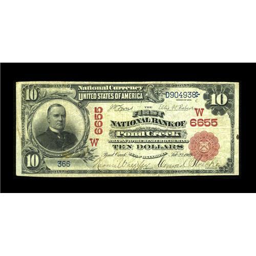 <B>Pond Creek, OK</B></I> - $10 1902 Red Seal Fr. 613 <B>The First NB</B></I> Ch. # (W)6655<BR>This is the most "common" bank in either the Oklahoma or Indian Territories for Red Seals, with eight examples in the census. Of course, that figure should also take into account that the entire census for both Oklahoma and Indian Territory Red Seals still comes in at fewer than a hundred pieces for all denominations and banks combined. This is a very attractive specimen, with a vivid red overprint, good centering, and the pen signature of Assistant Cashier Naomi Wheatley, likely one of the very few females to have signed Territorial National Bank Notes. Sharp <B>Fine-Very Fine.</B></I><BR><BR><b>Shipping:</b> Coin/Currency (<a target="_blank" href="http://www.heritageauctions.com/common/shipping.php">view shipping information</a>)