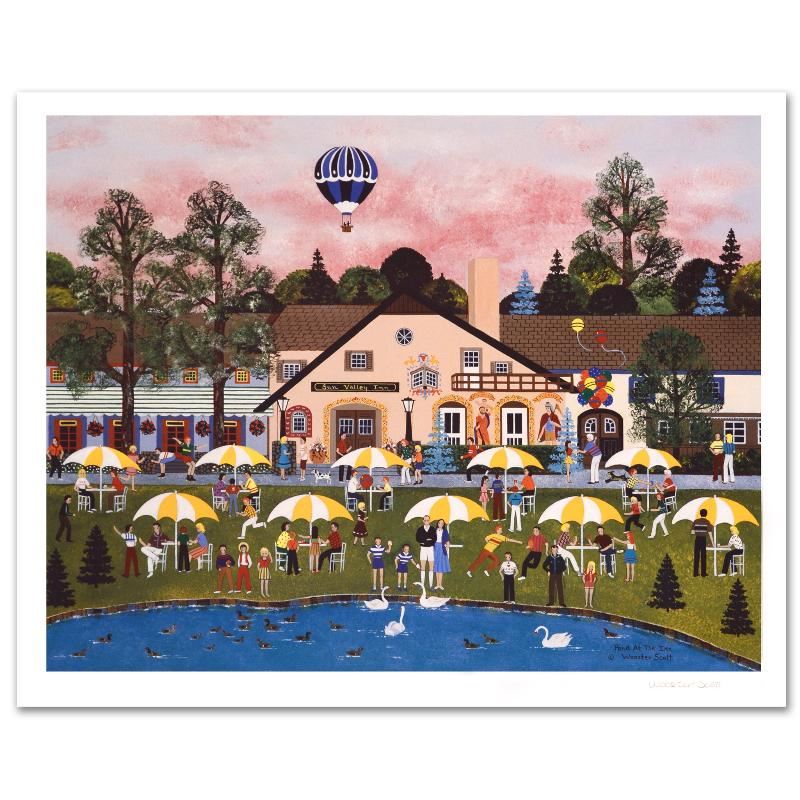 Cozy, down-home images of a bygone era when life was simpler - this is the feeling captured in the creations of one of the world's most recognized artists. "Pond at the Inn" is a limited edition lithograph on paper, numbered and hand signed by Wooster Scott! Includes Certificate of Authenticity! Measures approx. 25" x 20" (with border), 22.5" x 17.5" (image).