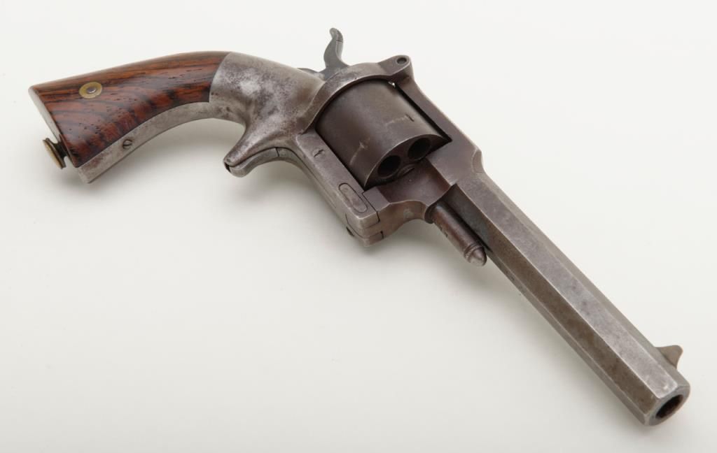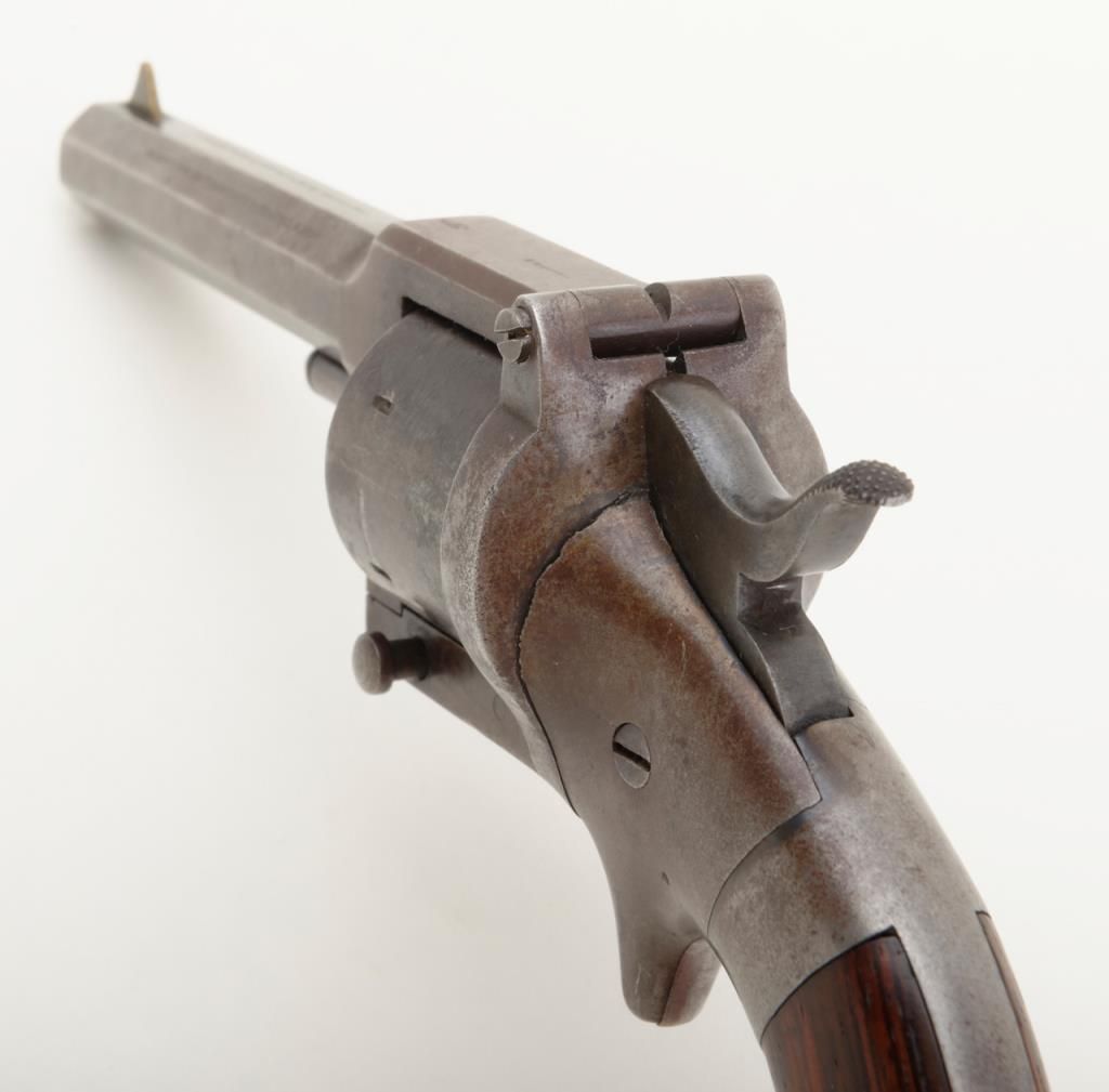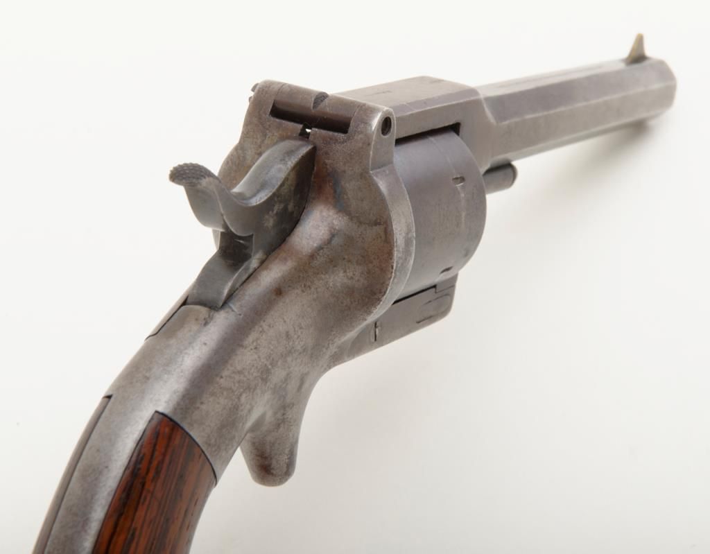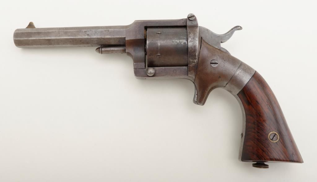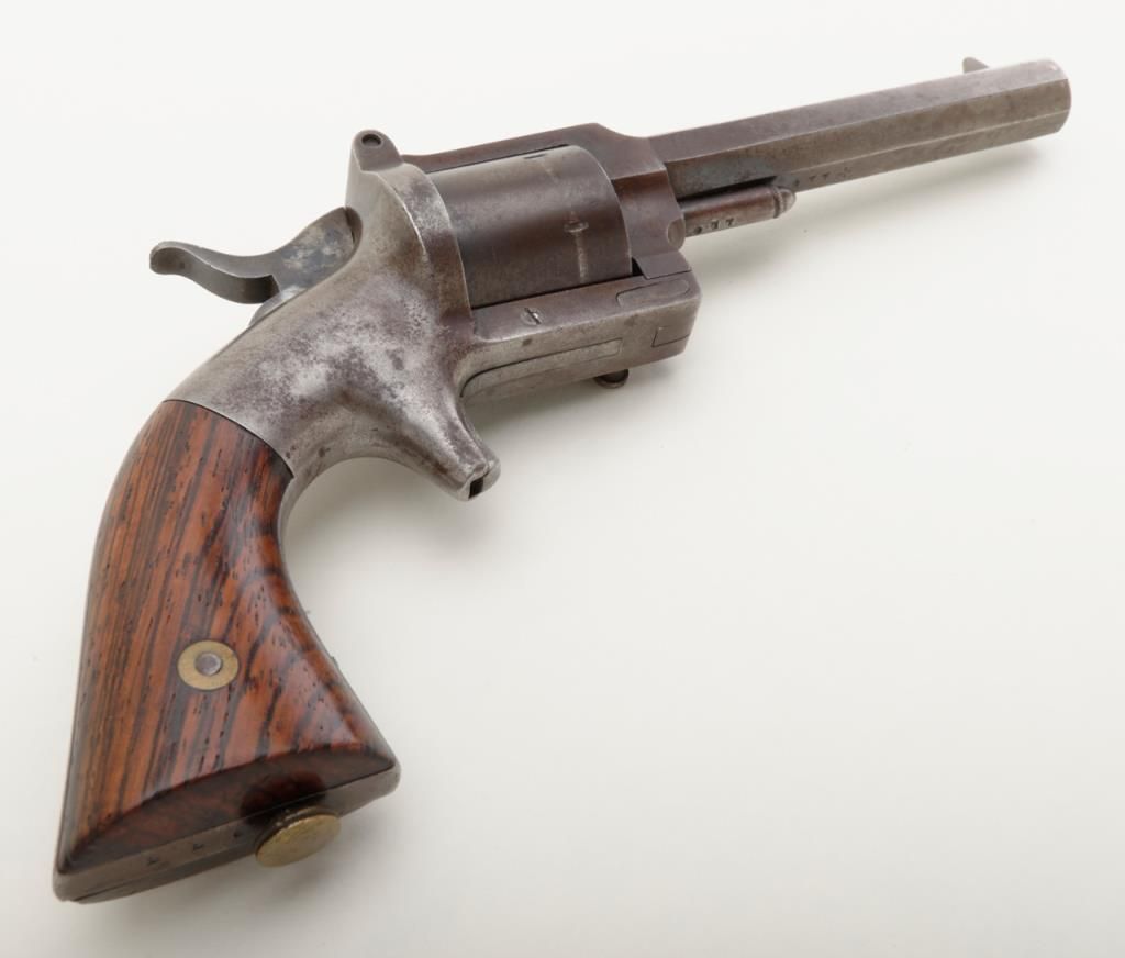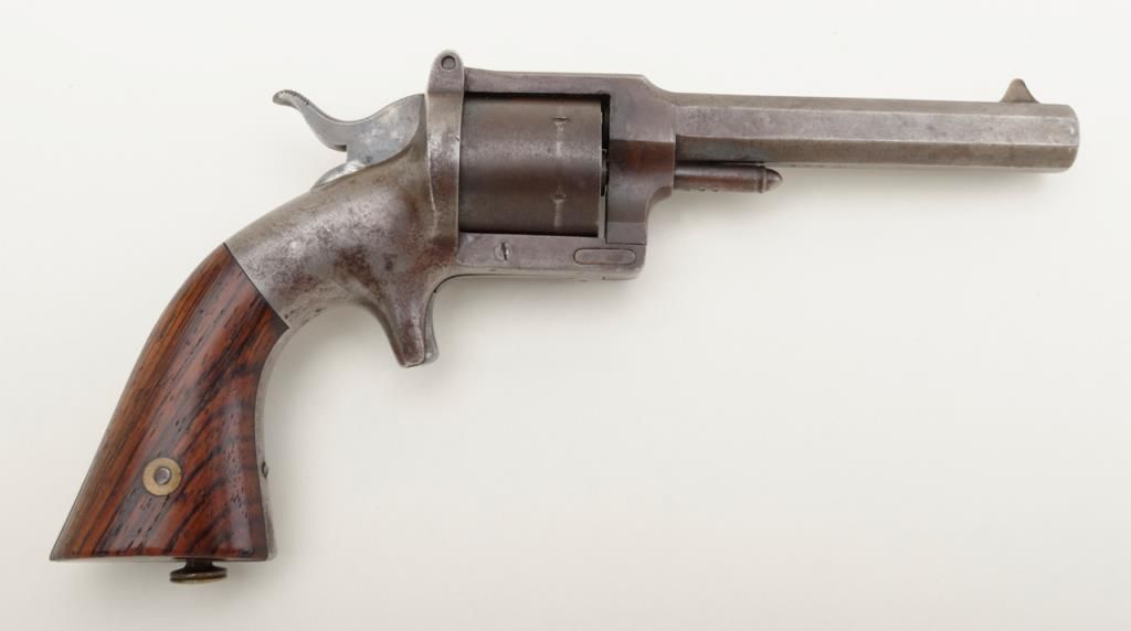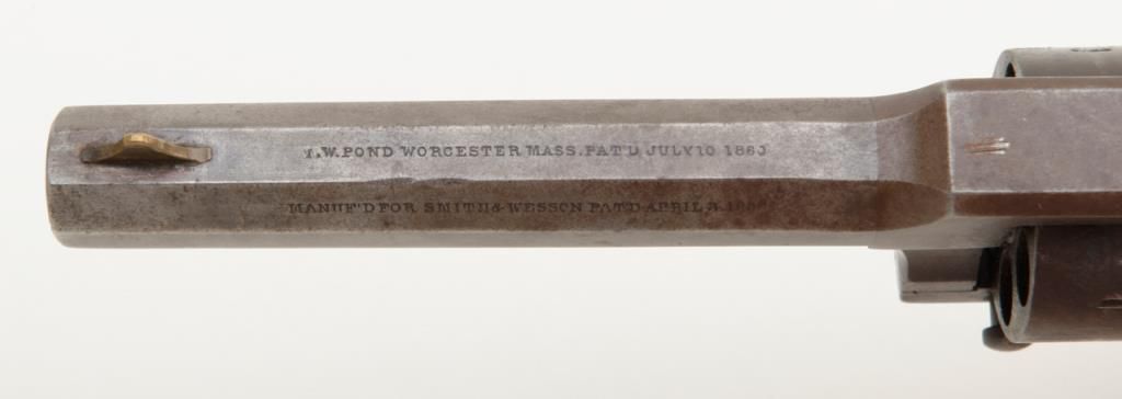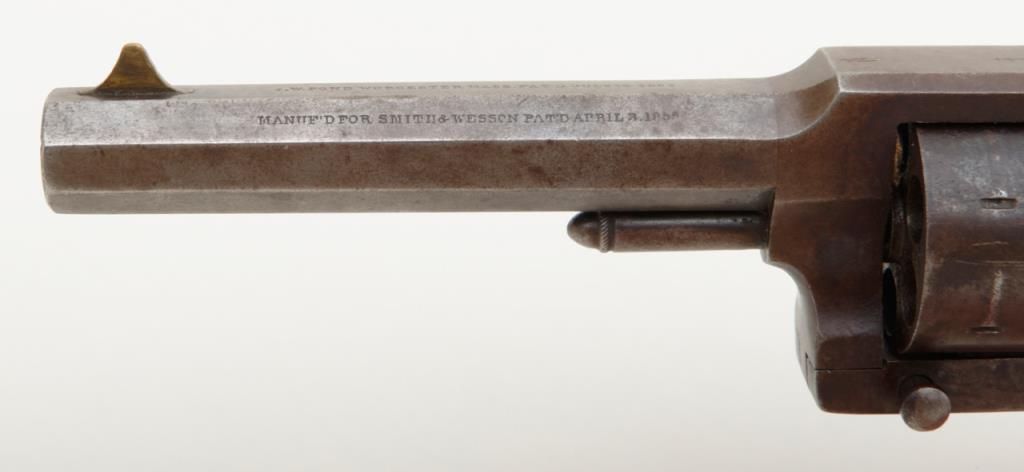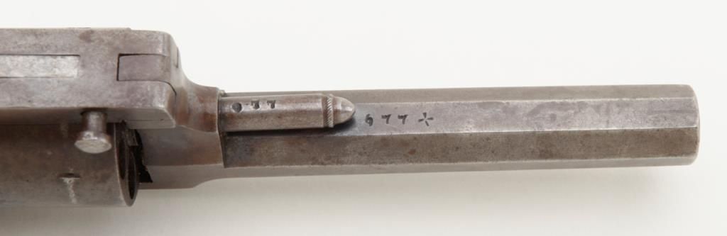 Pond spur trigger revolver, .32RF cal., 4” octagon barrel, wood grips, #977 with desirable “Manuf’d for Smith & Wesson Pat’d April 3, 1855” marking required after lawsuit by S&W against Pond for patent infringement. This gun is in overall very good condition showing traces of blue in protected areas with the balance gone to patina; good action and bore; very good markings and grips. (Antique). Est.: $250-$500.
