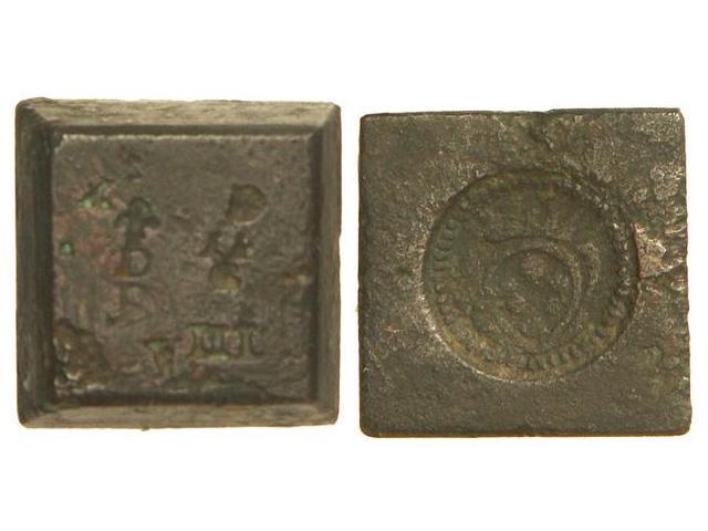 Ponderal 4 Croats o Reales. - S/F. - Anv.: Contramarcas VIII, flor de lis, D/R, D/II/¿G?. Rev.: Escudo heráldico con 6 puntos dentro, en contramarca redonda con orla. 12,60 grs. AE. Ø 17x17 mm. Cospel troncopiramidal. (Golpecitos y oxidaciones). Cru-No cat. MBC. - -