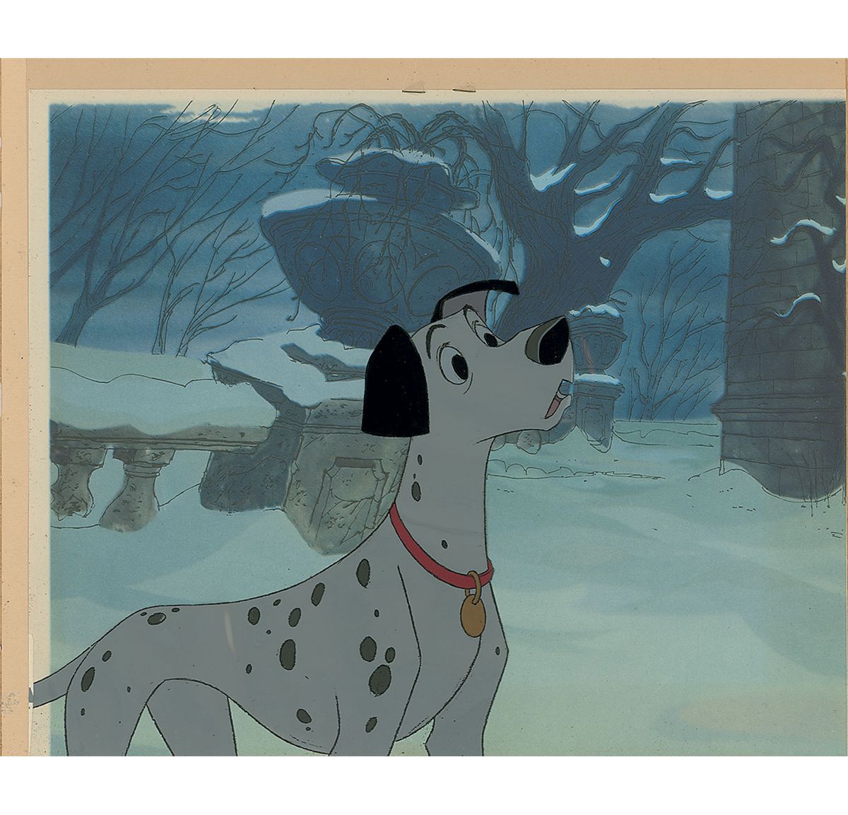 (Walt Disney Studios, 1961) Original production cel featuring Pongo from 101 Dalmatians. The cel is placed on a printed color background as issued. The cel is slightly trimmed to 12 x 10. Image measures 7.5 x 6.75. Stapled to a cardstock backing bearing a gold label on the reverse stating that it is an original hand-painted celluloid actually used in a Walt Disney production, and was released exclusively by Disneyland. In fine condition.