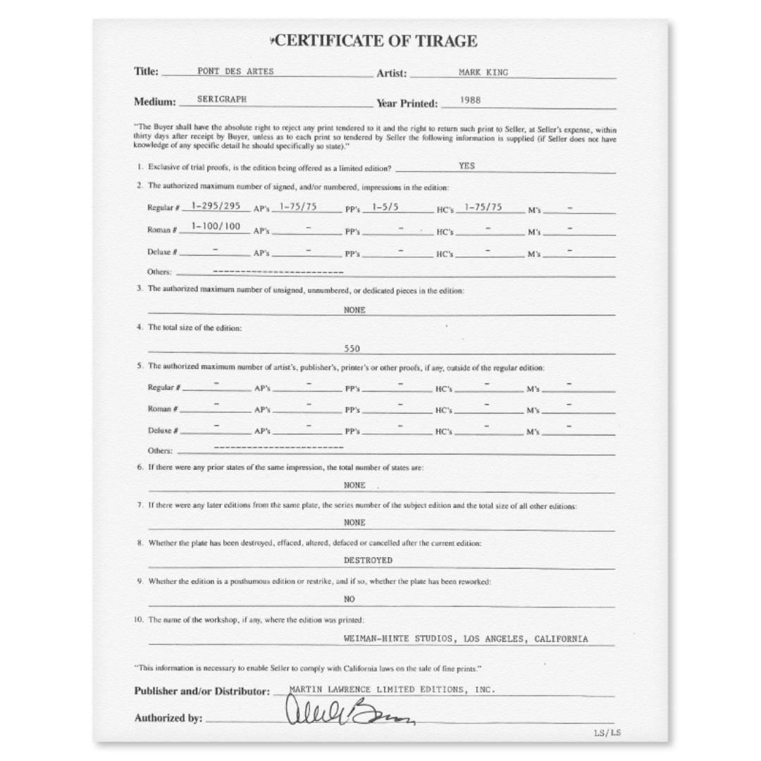 "Pont Des Artes" is a limited edition serigraph on paper by Mark King (1931-2014). Hand signed and numbered, this piece comes with a letter of authenticity and measures approximately 27" x 36" (image).