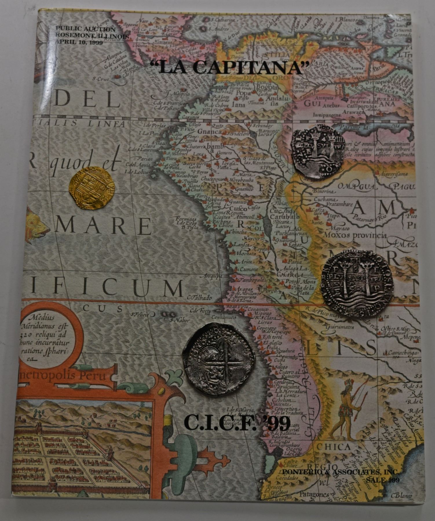 Ponterio and Associates, Inc. LA CAPITANA - C.I.C.F. '99. April 10, 1999. 4to, 64 pages; Softcover; Sale 99; PRL; This auction catalog includes 458 lots of 8 Reales cobs, 86 lots of 4 Reales cobs, 22 lots of 2 Reales cobs, 7 lots of 1 Reale cobs, and one gold 2 escudo cob from "La Capitana" (Jesus Maria de la Limpia Concepcion), which sank in 1654 off the coast of Ecuador. The lots include shield & cross issues, countermarked issues of 1652, transitional issues of 1652, and pillars & waves issues. The catalog also includes a history of the wreck, an article about the Bolivian counterstamps of 1652, and an article on Potosi's transitional coinage of 1652. Subject: History - Sunken Treasure