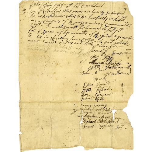 <B>(Pontiac's Rebellion - The Relief of Fort Pitt)</B></I> A fine collection of three manuscript Documents relative to the expedition commanded by Colonel Henry Bouquet to relieve Fort Pitt in the summer of 1763 -- in the opening days of Pontiac's rebellion. The lot includes a sign-up roll for a volunteer ranger company, a payroll for the company, and a receipt signed by one of its members. At the close of the French and Indian War in 1763, the Ottawa war chief, Pontiac, based at Detroit, called for war against the English by those tribes they were formerly allied with to defeat the French. British General Jeffery Amherst ordered Colonel Henry Bouquet to mount an expedition to relieve Fort Pitt, an important western post at the site of present day Pittsburgh. The relief force defeated a body of Delaware, Mingo, Shawnee and Wyandot at Bushy Run on August 5, 1763, saving the fort. Interestingly, it was during this campaign that Bouquet advanced the idea of infecting Indian trade blankets with smallpox to act as a biological weapon against the hostile tribes. The documents offered here include a <B>manuscript Document Signed</B></I> by fourteen volunteers, one page, 7.25" x 9.25", Fort Cumberland, July 26, 1763, who are "<I>..to be lawfully enlisted [sic] in a company of Rangers under ye command of Capt. Leumel Barett for to march to fort pitt for ye space of two months...</B></I>" The second document is another <B>manuscript Document Signed,</B></I> "<I>Lemul. Barrett</B></I>", one page, 12.5" x 7.5", Fort Bedford, August 20,. 1763, an "<I>Acc[oun]t of Subsistance [sic] for a Party of Voluntiers [sic] Commanded by Capt. Lemuel Barett</B></I>" listing the names of twelve officers and men, their dates of enlistment and discharge as well as the amounts of money owed to them. It lists Lieutenant David Bursdall who was killed on August 5, 1763 when the party was attacked by Indians near Bushy Run. On the verso several of the members have added their signed endorsements noting receipt of their pay. The third piece is a <B>manuscript Document Signed</B></I> by Thomas Simpson with his mark, "<I>x</B></I>" one page, 7.5" x 4.5", "<I>Fort Bedford</B></I>", Dec. 29, 1763 in which Simpson acknowledges receipt "<I>...by Coll. Bouquet's Order five Pounds... on Acct of the time I have lost during the Cure of a Wound I received in the Belly at the Battle of Edge hill last August...</B></I>" A rare set of documents from one of the more tragic episodes in early American history. Overall condition is very good with some irregular margins, light soiling and the expected folds. It is almost impossible to source material from this period; this is a fine representative group. From the Henry E. Luhrs Collection.