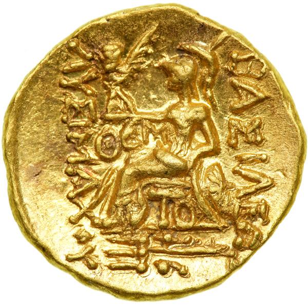 Pontic Kingdom. Mithradates VI, 120-63 BC. Gold Stater (8.32 g) minted in the type of Lysimachus, c. 88-86 BC at Tomis. Head right of the deified Alexander the Great wearing the horn of Ammon above ear. Reverse: Athena Nikephoros enthroned left; mintmark on throne; beneath, trident. SNG Cop 1091; Müller 273. Some typical die rust. NGC graded.