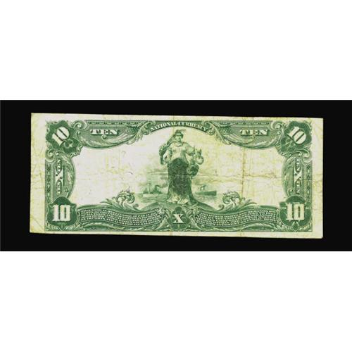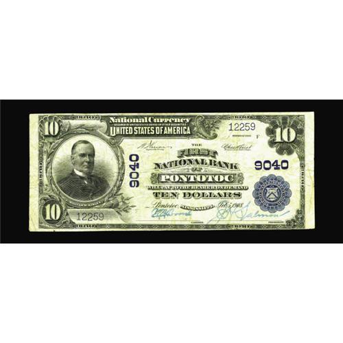 <B>Pontotoc, MS</B></I> - $10 1902 Plain Back Fr. 626 <B>The First NB</B></I> Ch. # 9040<BR>Neatly stamped blue signatures of the officers are found on this $10 that is bright for the grade. Cashier W.A. Boone would go on to become president of this bank. <B>Fine.</B></I>