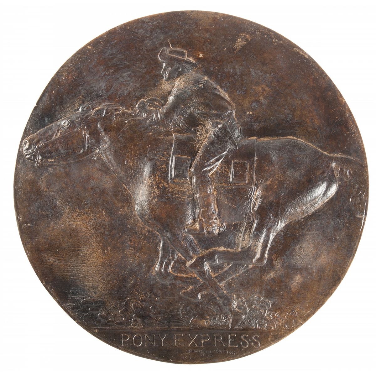 Wells Fargo Co. commissioned this plaque for the 50th anniversary of the Pony Express in 1910. The plaque shows a cowboy on horseback riding on a fast galloping horse going to the next relay station. The plaque is signed lower center by Proctor under the Pony Express logo. The plaque was made to mark 60 of the original 190 Pony Express stations that had been built between St. Joseph, Missouri and Sacramento, California. Each monument would be decorated with a commemorative bronze plaque mounted into the building, rock plinth, or some other suitable base. The bronze plaque is listed in the Bergmann books on bronzes, volume 4 on pages 1184-1185 and 4759. This is a great depiction of an era in communications that lasted only 15 months in time. The plaque measures 17 inches in diameter and weighs 12 pounds. (Am: 1862-1950)
