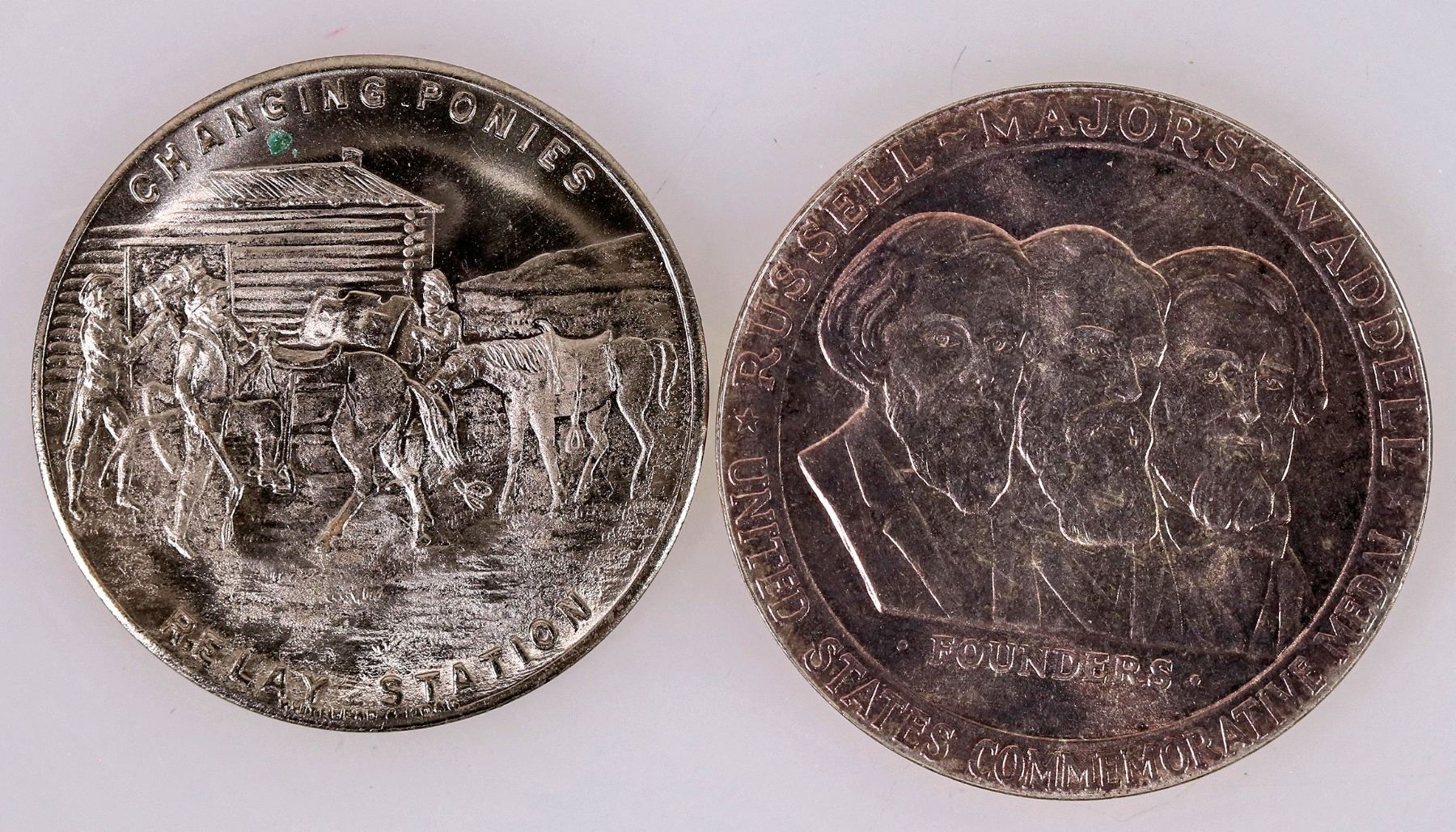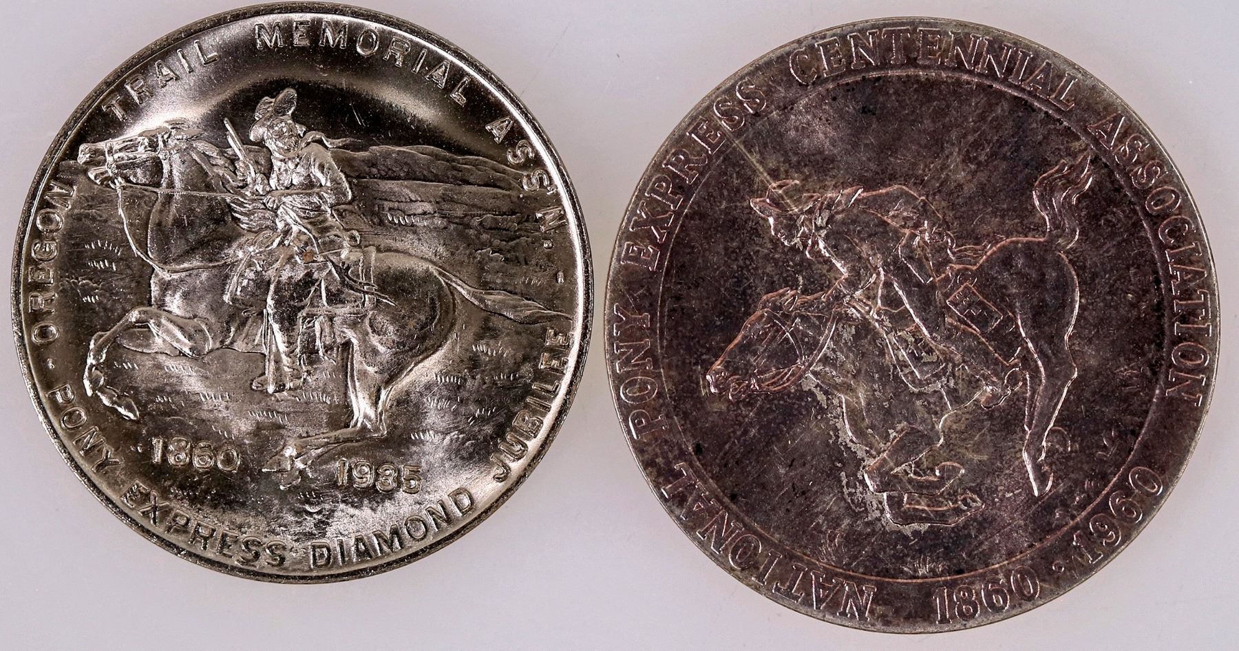 Two Pony Express medals: 1) HK-582 silver. Obv. Three conjoined male heads part r., below • Founders • all within center circle; outside, above around * Russell-Majors-Waddell *; below United States Commemorative Medal. Rev. In center circle is Pony Express rider at gallop to l.; outside above, around National Pony Express Centennial Association; below 1860 • 1960; 33 mm; unc. 2) 1935 Pony Express Diamond Jubilee, BU; nickel/silver; 13.8 grams; 31 mm.
