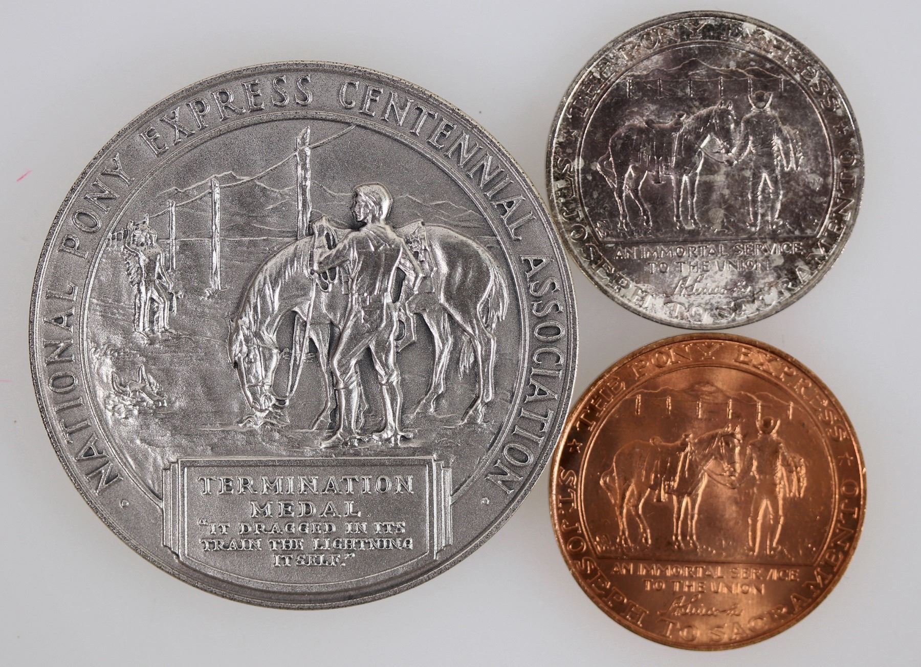 Three Pony Express Termination Medals, 1961. 1) This large silver Termination Medal is numbered 383 of 1,000 (on original box), was struck at the US Mint in Philadelphia, and weighs 4.2 ounces. It features owners Russell, Majors and Waddell and a telegraph key. On the reverse is a dismounted pony rider watching a part of the telegraph line which caused the end of the Pony Express. This and the Termination Medal are the only official medals that commemorate the centennial. Round, 57 mm, uncirculated, in original US Mint box. 2) Same silver medal as above but 33mm, uncirculated, in original Philadelphia Mint envelope. 3) Same as above but bronze, 33mm, uncirculated, in original Philadelphia Mint envelope. Douglas McDonald Collection.
