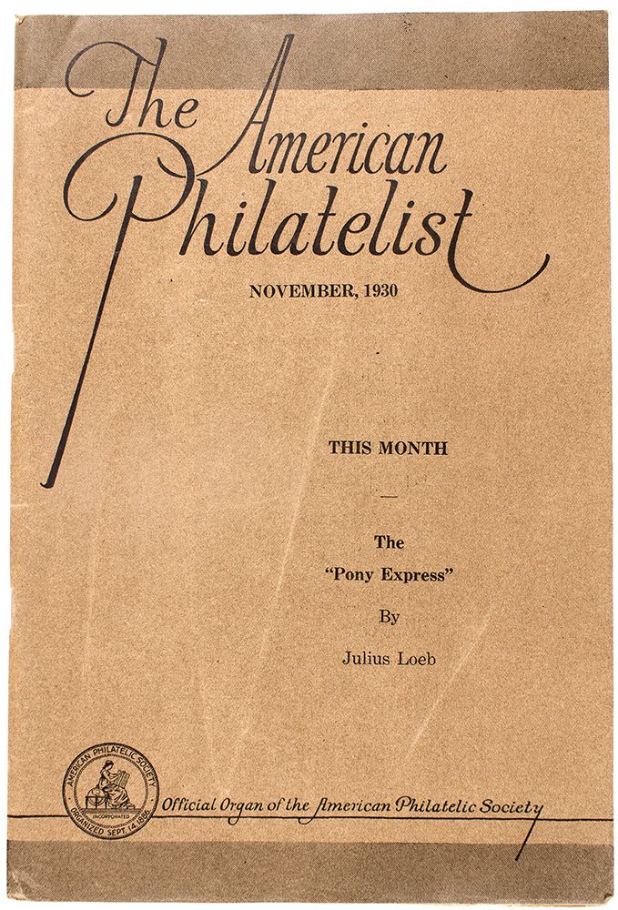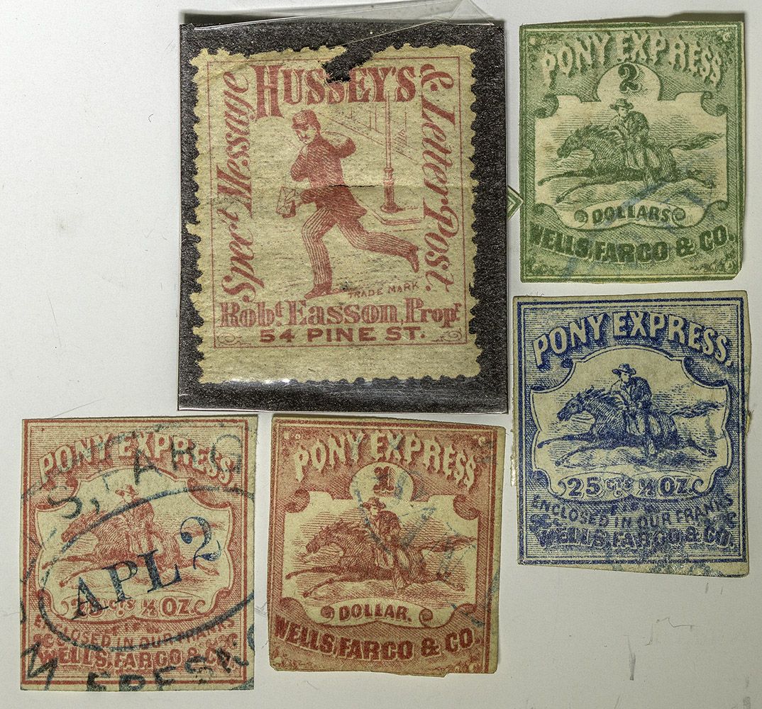 c1860 Lot of 6 Wells Fargo Pony Express stamps and 1 book. 1) Wells Fargo Pony Express $1.00 Red. 2) Wells Fargo Pony Express $4.00 Green. 3) Wells Fargo Pony Express $2 Green. 4) $ Wells Fargo Pony Express 25c Blue. 5) Wells Fargo Pony Express 25c Red. 6) Hussey's Special Message Letter red postage stamp. 7) The American Philatelist November, 1930 featuring the Pony Express as the main topic. It was written by Julius Loeb. Lynn Langdon Collection - HKA#65524