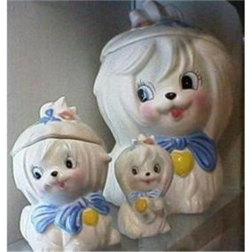 This is an adorable looking puppy cookie jar and accessories. He has the sweetest face and the glaze has a wonderful satin finish. Made by the Zolton Lefton Co. in Chicago which imported cookie jars from Japan.Jar lid has 2 minor chips which are not visible when the lid is in place. Photo will show the chips. Otherwise in good condition.