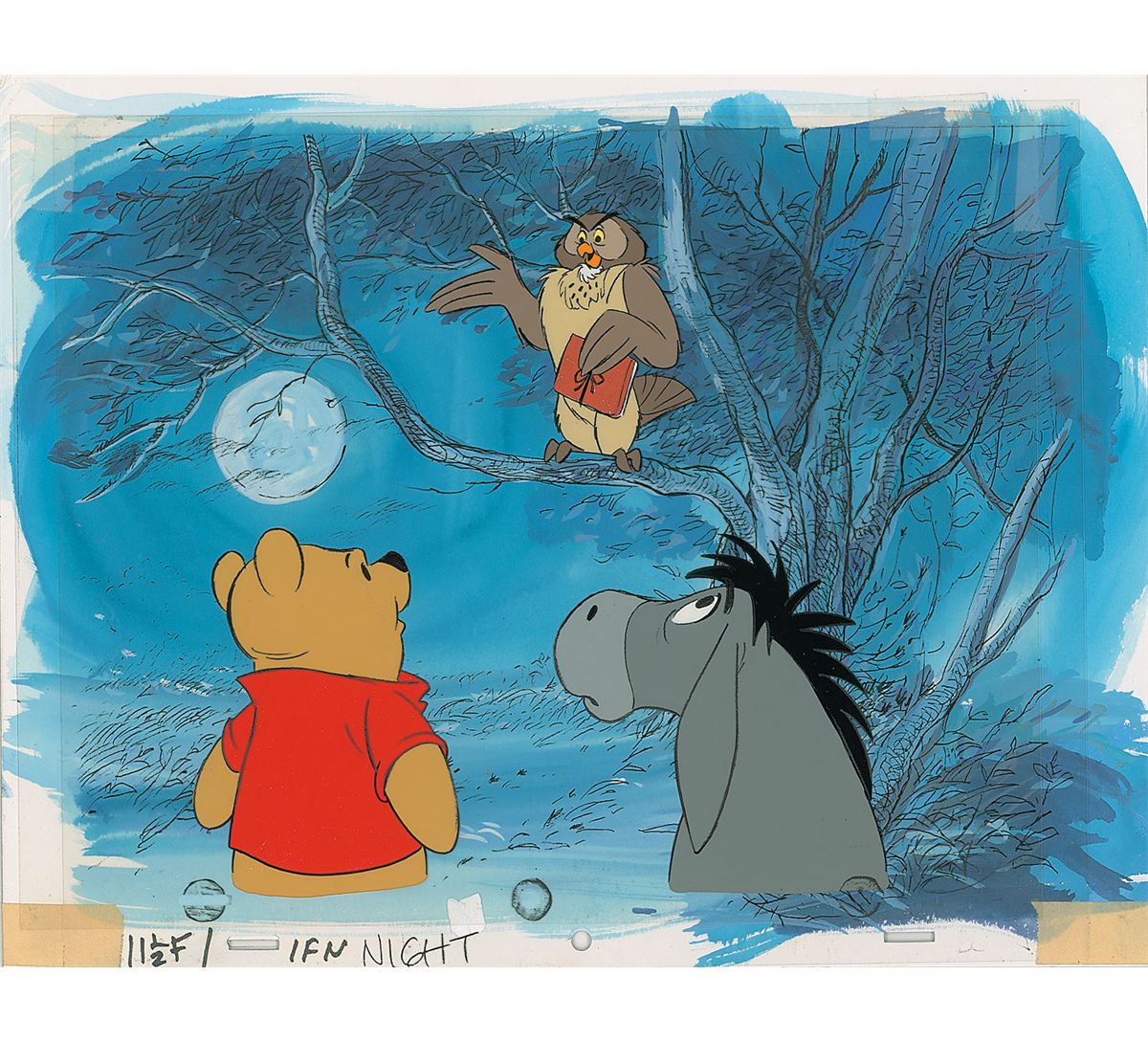 (Walt Disney Studios, Circa 1980s) Original production key master cel and background setup featuring Pooh, Eeyore, and Owl from an educational filmstrip. The cel is placed on a hand-painted production background. Pooh measures 3.25 x 4.5, Eeyore measures 4 x 4.5, and Owl measures 3 x 3.25, with overall dimensions of 14 x 11. In fine condition.