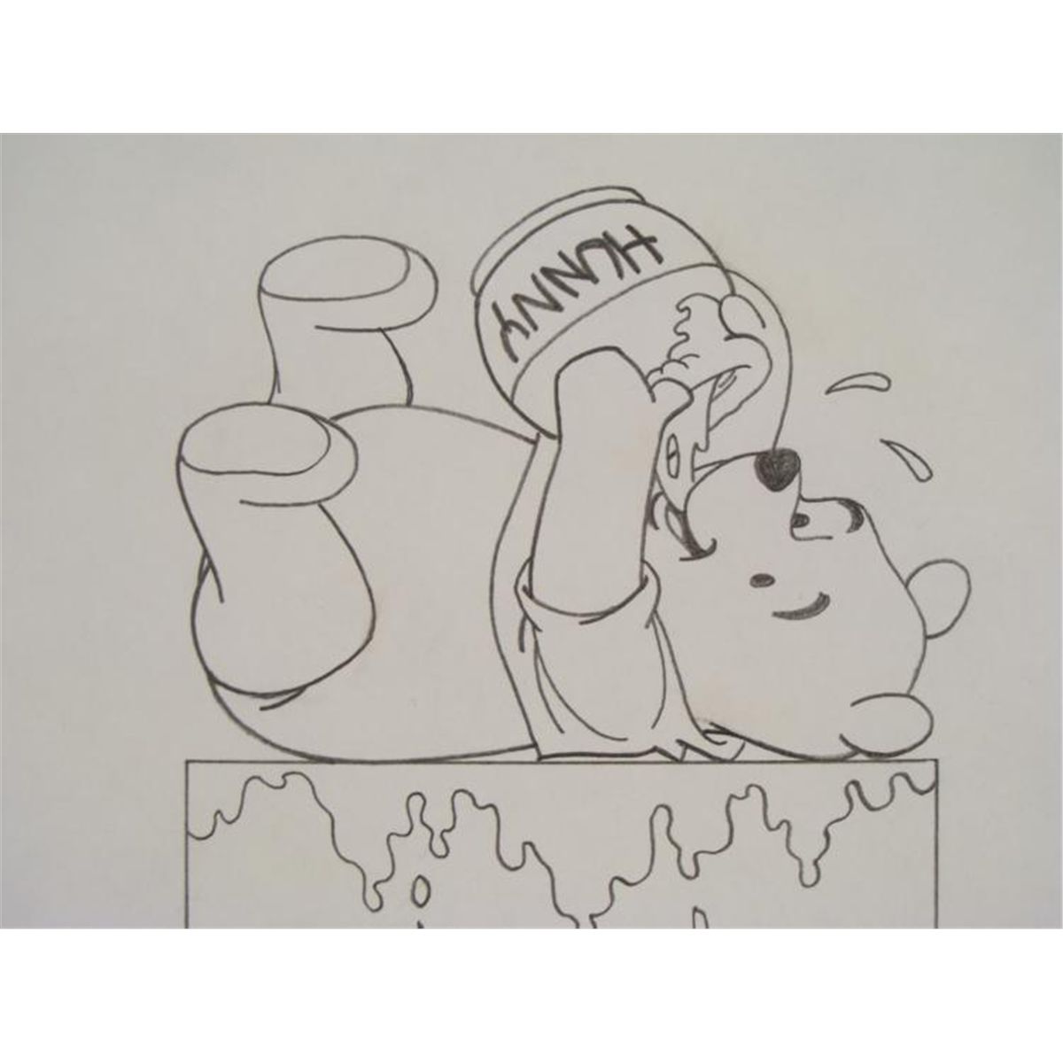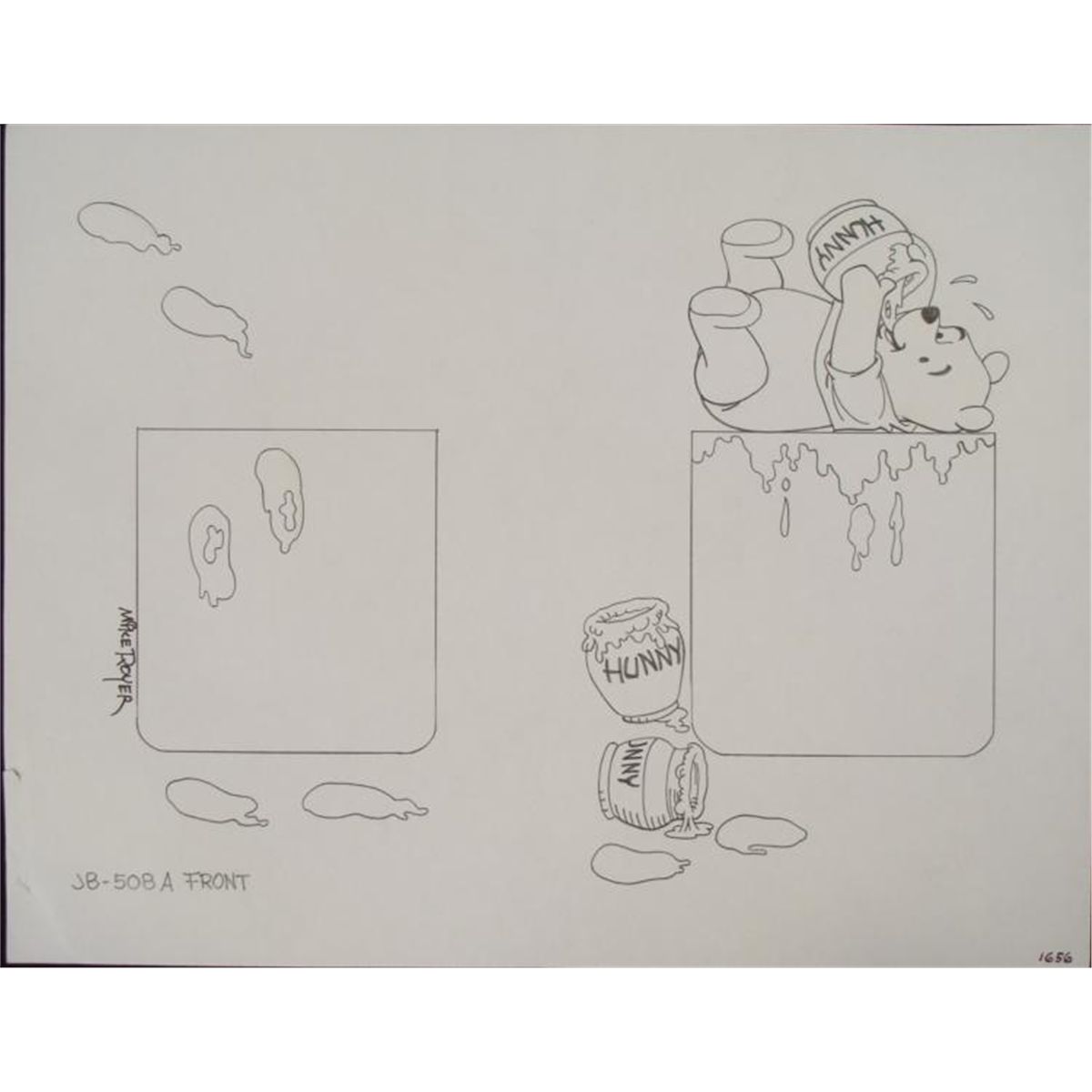 Hunny, Hunny, Hunny everywhere! Pooh can never get enough hunny. This original animation concept drawing is signed by the animator himself. * * Artist: Mike RoyerSignature: In black ink lower left * Medium: Black pencil on paperSheet size: 8 1/2 x 11 inchesCondition: Excellent