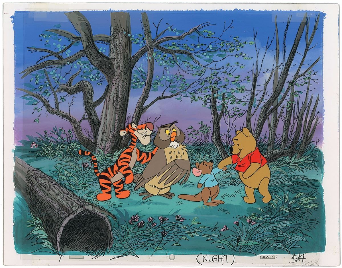 (Walt Disney Studios, circa 1980s) Original production key master background set-up featuring Pooh, Owl, Tigger, and Roo from the educational cartoon We’re Each a Little Different. The cel is placed on a hand-painted production background from the same film. Image measures 8 x 3.5, with overall dimensions of 14 x 11. In fine condition.