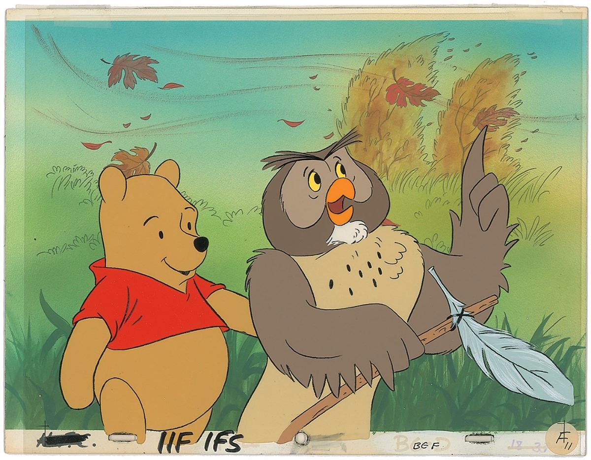 (Walt Disney Studios, circa 1980s) Original production key master background set-up featuring Pooh and Owl from an educational cartoon. The cel is placed on a matching hand-painted production background from the same film. Image measures 11.5 x 7, with overall dimensions of 13 x 10. In fine condition.
