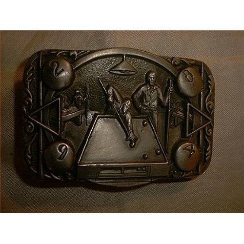 Pool Hall Belt Buckle, made by C & J Inc. "C" 1990 Made in USA. Shows people playing a game, and it show all the table, sticks, guys, balls, etc. Really a real nice one. It looks like pewter, but maybe white metal. It is in real great condition, looks great, and will look good in any collection you have. If you a pool player, then take a real good look at this one, as it is really in great condition. It stands out really well, great show item. Hope you like it.