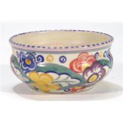 Poole Pottery Carter Stabler Adams Art Deco bowl, hand painted with a band of stylized flowers, marks and initials to base, 14cm diameter