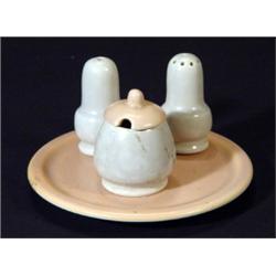 Poole Pottery mushroom and salmon glazed cruet on stand, marks to base
