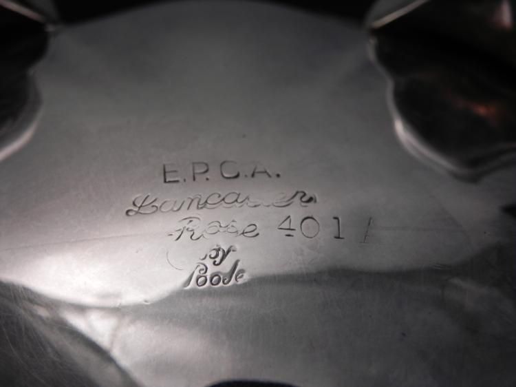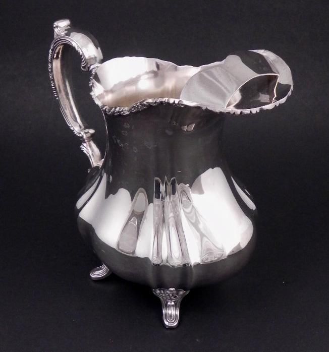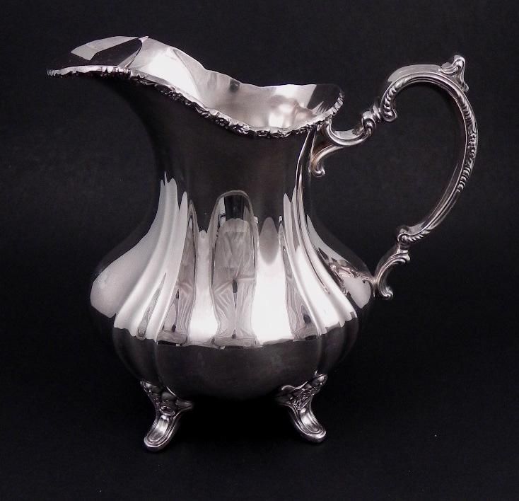 This is a silver plated water pitcher, with elegant floral trail around the lower edge of the rim, and on the handle. The decorative feet also have a floral design. The spout area has an ice-lip, which is a useful extra. The markings on bottom read EPNS Lancaster Rose by Poole 401A. It is 9" tall at the highest point on the handle, 9 1/2" across at its widest point from spout to handle, and 7" wide at the body. * There is light wear, but overall this is bright and in excellent condition. * * This is a gorgeous pitcher for your table service.