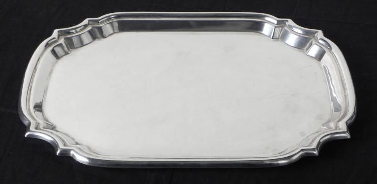 This is a sterling silver serving tray by Poole, marked number 372. The elegant shape, and rounded rim give shimmer to its beautiful look. The dimensions are 16 x 11 1/2 inches, and its weight is approximately 2 pounds. Its condition is very good, with light marks, and several small dings. * This is a bright and lovely sterling tray from the fine American silver company.