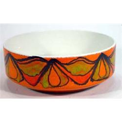 Poole pottery Delphis fruit bowl decorated with abstract pattern in greens and reds on an orange …