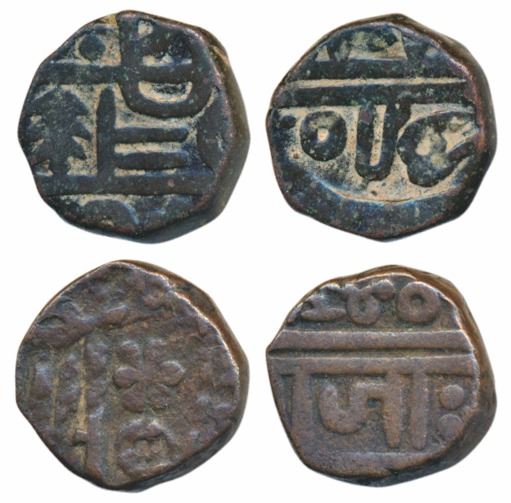 Poona Mint, Copper Shivarai Paisa (2), transitional issue of the EIC, in the name of Chhatrapati Shivaji, Chhatra/ Pati on obv., Shri/ Raja / Shiv on rev., the first with Fasli date (1)240 and beaded flower, the second without date, with leaf symbol. Very Fine. (2)