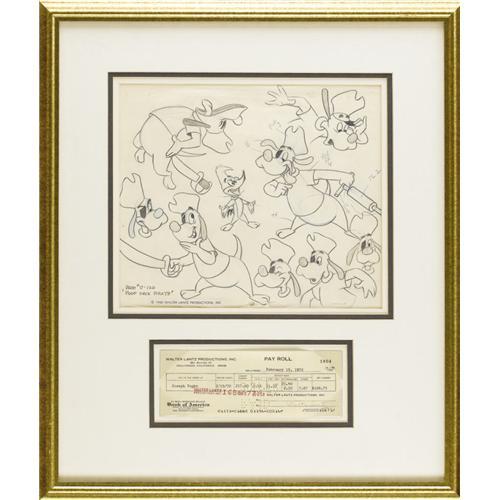 <B>"Poop Deck Pirate" Model Sheet Animation Art and Walter Lantz Signed Payroll Check (Walter Lantz Productions, 1961).</B></I> Woody's quest for peace and quiet on Tutti Frutti Island is sabotaged by the pirate Sea Dog Sam, in Lantz's 1961 short, "Poop Deck Pirate." Various views of Sea Dog Sam and Woody fill this model sheet, which has an image area measuring 12" x 10". There is some light paper tanning, light creasing, and edge wear; otherwise the condition is Very Good. Also includes a Walter Lantz signed payroll check from Walter Lantz Productions. Matted and framed. <BR><BR><B>Important notice:</B> Heritage usually auctions material at the rate of 200-250 lots per hour. On some occasions eBay Live bid software or the Internet may not be able to keep up with the pace of the auction. We recommend placing a realistic absentee bid now as insurance to avoid disappointment. Occasionally the auctioneer may eliminate or reject an eBay Live bid, and the auctioneer may also reopen a lot after the close of the eBay live bidding (usually because we missed an audience bid), and may reject your bid even if it shows you as the winning bidder. By bidding via eBay Live, you agree that Heritage may award the lot to another bidder at its sole discretion under the circumstances described above or any other reasonable circumstances. Since eBay bids are not shown to us until we open the lot on the floor, we treat those bids just like floor bids. In most cases the floor responds before the eBay bid is presented to us, due to Internet lag time, so for consistency we have made it a policy that floor bids are always considered first over tie eBay live bids. Also please note that all Heritage lots purchased through eBay Live carry a 22.5% Buyer's Premium. Please make sure you read the Terms and Conditions before you bid. This lot is being auctioned in conjunction with a live floor auction by Heritage Auction Galleries. All final auction and invoice information will be supplied by Heritage Auction Galleries, and all other information should be considered preliminary. Lot:41001 <BR><BR><B>Winning Notification and Billing:</B> After the FINAL session in this auction is complete, Heritage will send e-mail and snail mail invoices. This process normally takes several days. All final auction and invoice information will be supplied by Heritage Auction Galleries, and all other information should be considered preliminary. <BR><BR>This auction will be conducted on a live auction floor and over the Internet through eBay Live. If you choose to place an absentee bid, please take a moment to <font color='#0000ff'><u><a href='http://pages.ebay.com/liveauctions/help/before/laabsentee.html'>learn how eBay Live absentee bidding works</a></u></font><font color='#000000'>