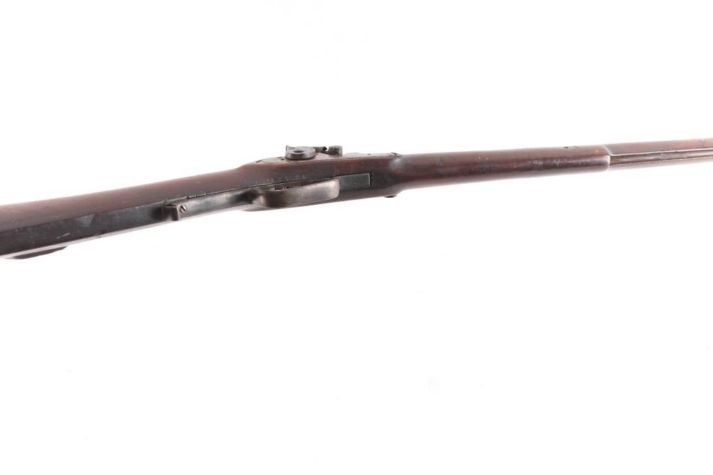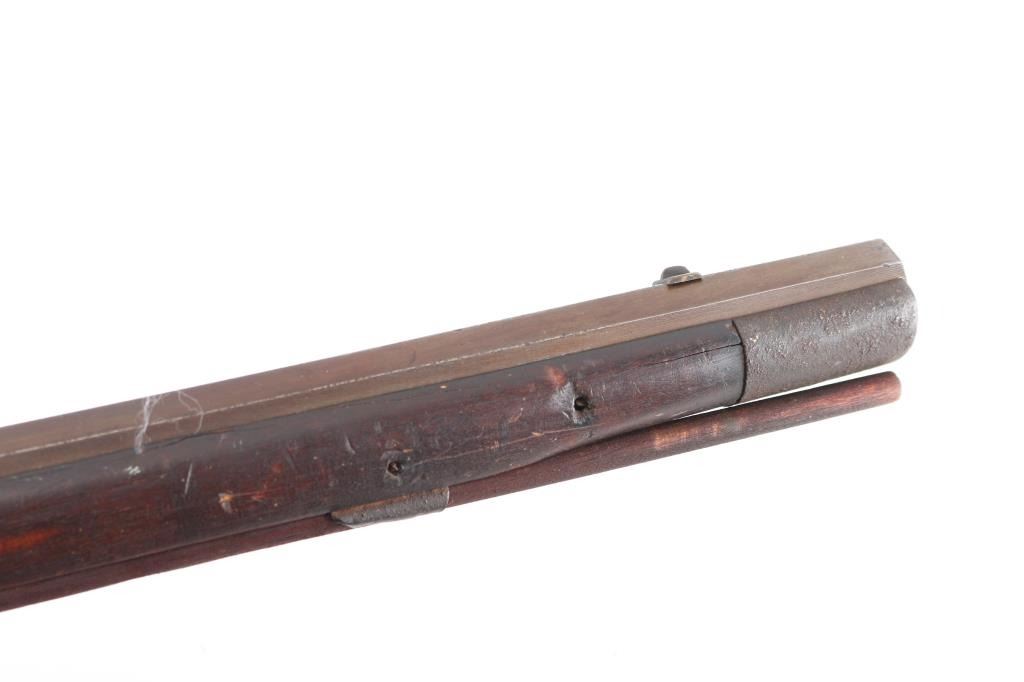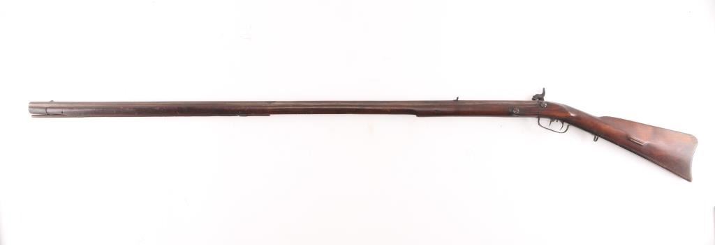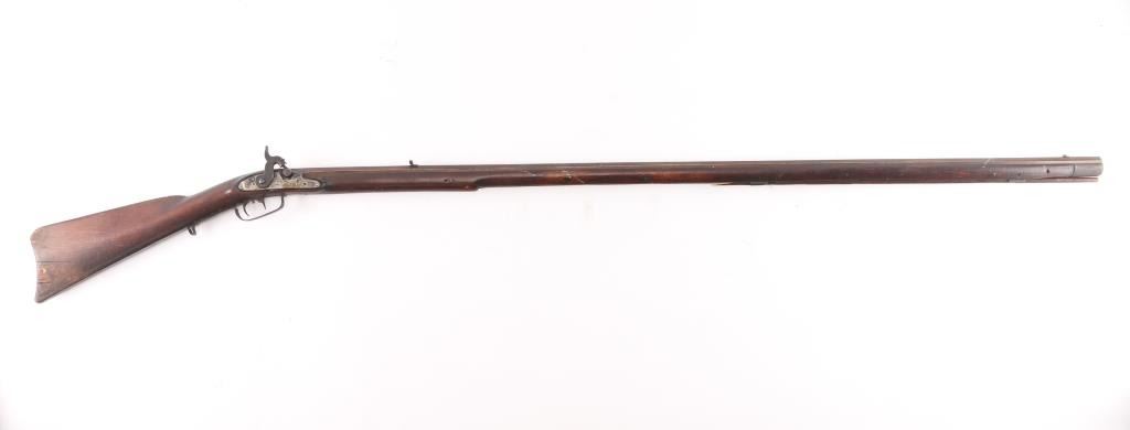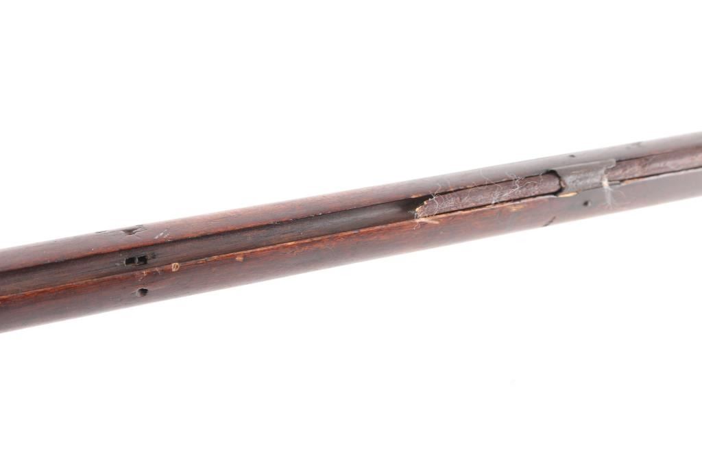 Full stock "poor boy" long rifle with iron trigger guard possible Tennessee or further south. Originally flint conversion to percussion. 62" overall w/ 47" BBL in approx. 36 cal rifled. 5 notches cut in top of comb (Yankee's?) stock shows loss around top of lock and small losses to wood butt, otherwise fair to good condition. Metal is a grey / brown Patina that is fairly smooth except pitting at firing area at breech, action need repair. Ramrod is broken.