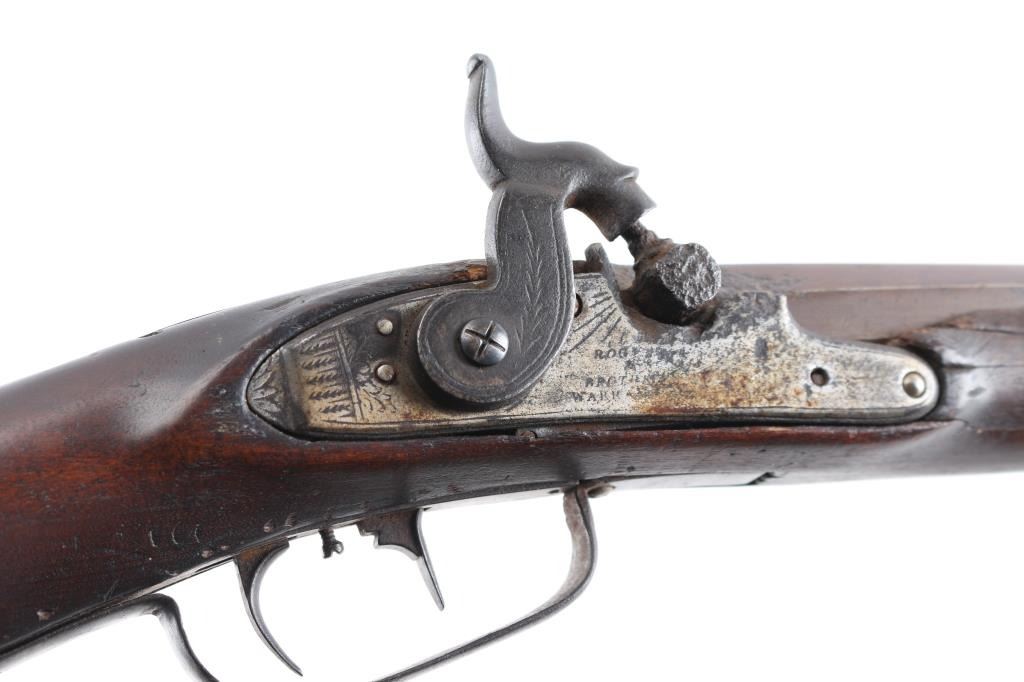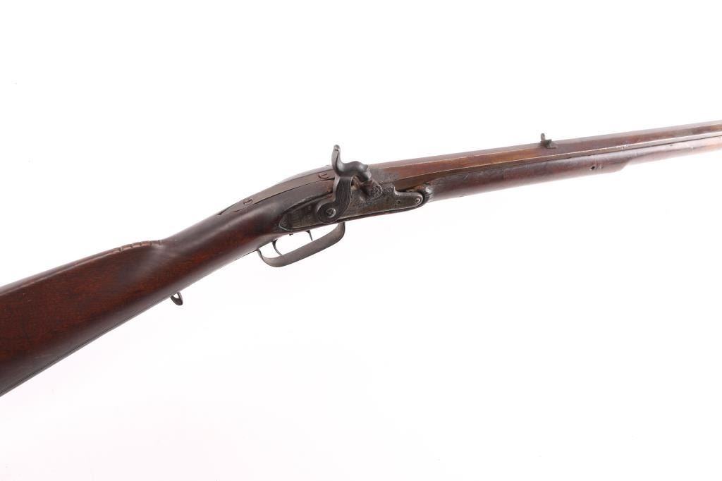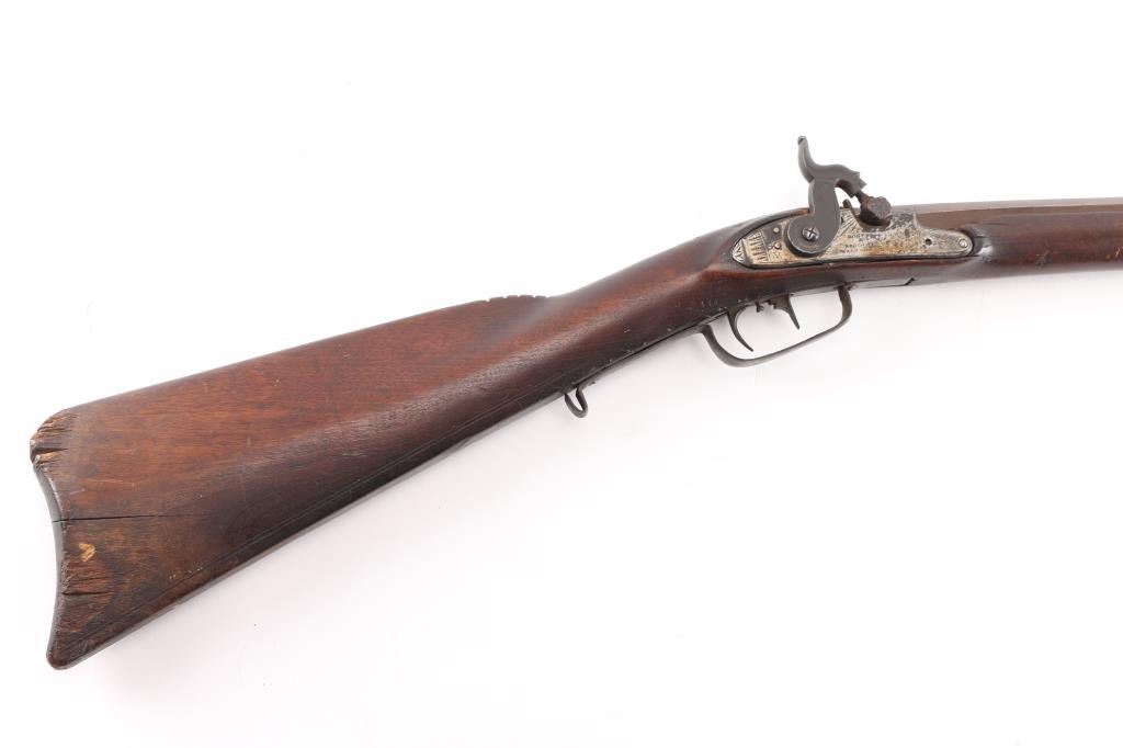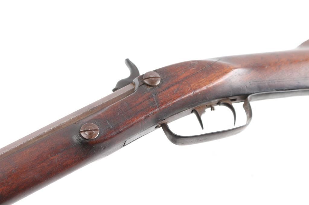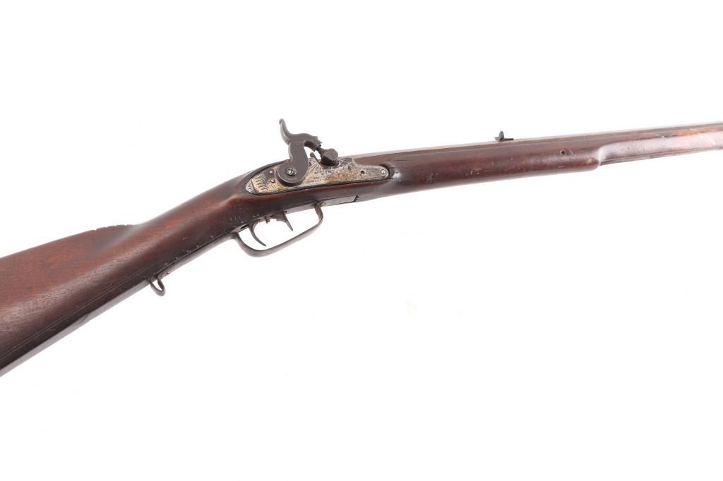 Full stock "poor boy" long rifle with iron trigger guard possible Tennessee or further south. Originally flint conversion to percussion. 62" overall w/ 47" BBL in approx. 36 cal rifled. 5 notches cut in top of comb (Yankee's?) stock shows loss around top of lock and small losses to wood butt, otherwise fair to good condition. Metal is a grey / brown Patina that is fairly smooth except pitting at firing area at breech, action need repair. Ramrod is broken.