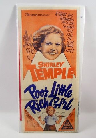 Shirley Temple's "Poor Little Rich Girl" (1936) affected a whole generation of young film goers what with its plot of a young girl who becomes lost in the city, and is taken in by a whole new family. Truly one of the best of her series of films for 20th Century Fox and one of the most successful. This is a one-of-a-kind extremely rare Australian Insert Poster from the movie. A true one-of-a-kind collectable. In good condition with patina aging, and some small pinholes on the lower left half, plus a small label stain on the lower left hand corner. 13.5" x 30"