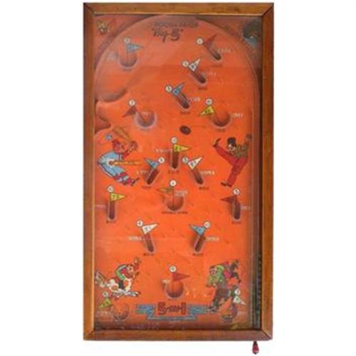 A blast from the past before video games were the norm. This game combined 5 fun games in one. Put-N-Take, Base-ball, Twenty-One, Pennants and Bagatelle are all included here. Clowns in bright vivid colors decorate this vintage piece. The balls and racks are metal with a wooden frame. The top still has it's original glass without a crack, chip or mar. It measures 23 1/4" tall by 13" wide. The patent number of 1925018 dates this piece to 1934. A very similar item sold at Skinners in 2003 for $345. (Information is from our appraiser's database)  Don't miss this chance to add this to your collection or it would make a wonderful gift for that toy collector in your life.