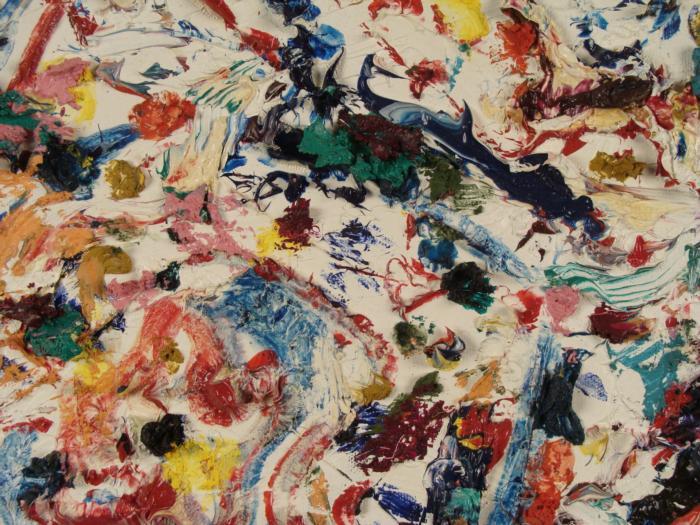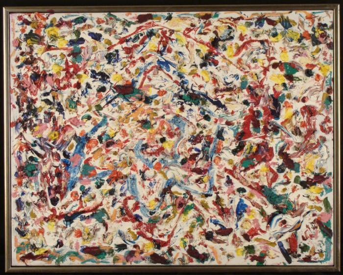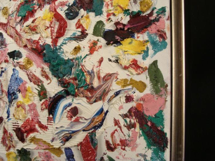 This painting has many colors, and it appears to be inspired by Jackson Pollock. The paint is applied in thick layers, apparently squeezed right out of the tubes. Medium: Paint on canvas, stretched Canvas size: 22 3/4 x 28 inches Framing: Set in matte black laminate and silver painted front wood frame Frame size: 23 x 28 3/4 inches Condition: Excellent This is a fine piece of abstract art that is certainly worth its weight in paint.