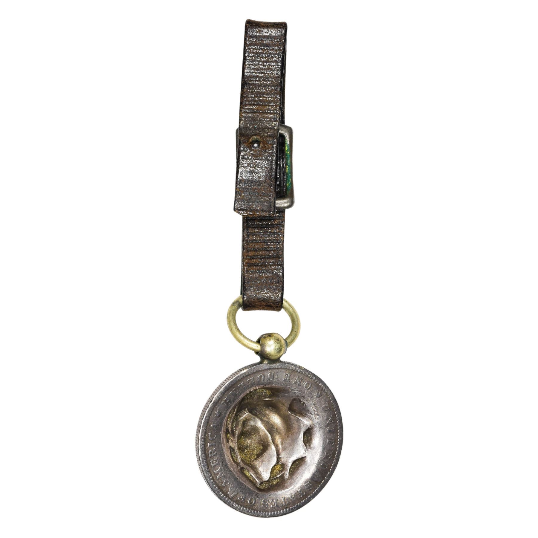 Pop-Out. 1891-O Morgan $1 Leather Strap Watch Fob. Overall EF. This warm lilac-gray Morgan dollar repoussé with head of Liberty details is attached by ball and loop to a ¾” thin leather strap with a silvered brass watchband catch. The sort of item Morgan dollar specialists should treat themselves to on occasion.