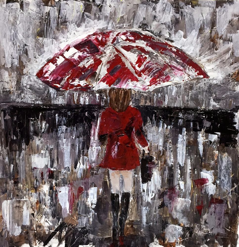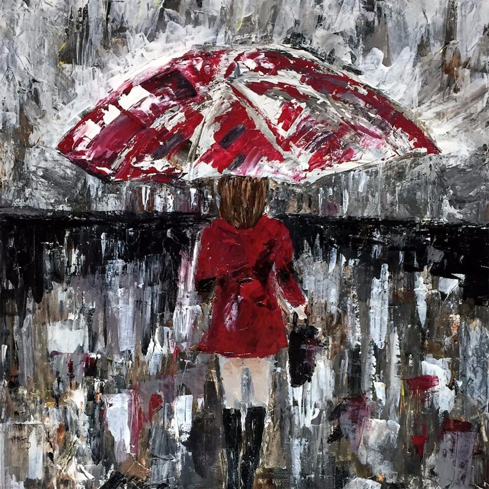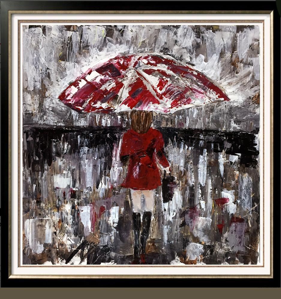 Janier | Title of Art: Red Umbrella| Medium: Hand Signed Original Acrylic on Canvas | Edition #: Original | Unframed Size: 20x20 | Framed Size: Offered Stretched. Framing presentation if shown is for concept only. If you need assistance with custom framing, call the experts at ArtForSale