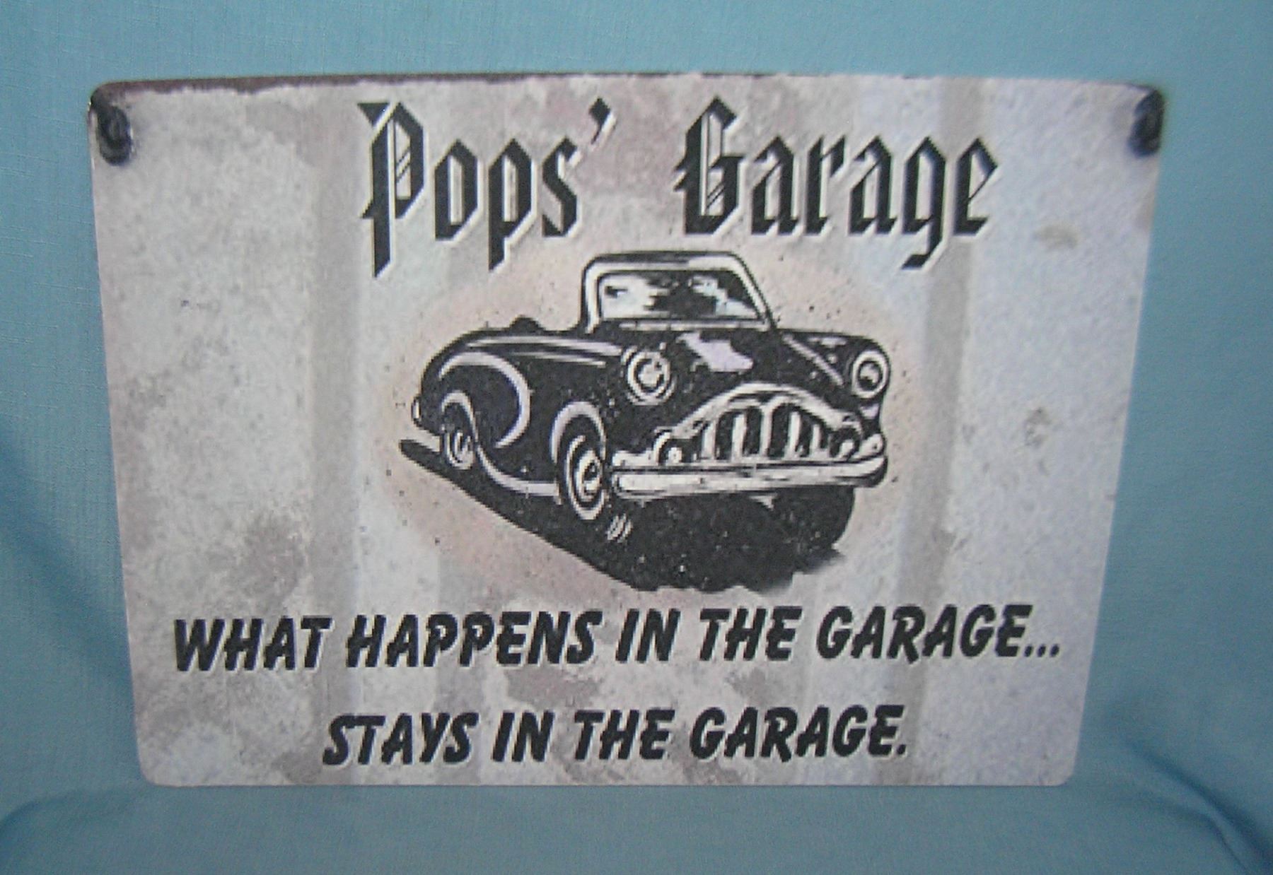 Pop's Garage What Happens in the Garage Stays in the Garage retro style advertising sign printed on PVC hard board12 by 16 est. value $50.00-$60.00