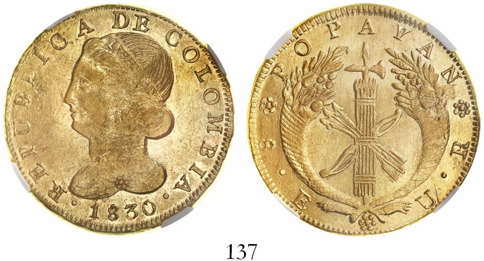 Popayan, Colombia, 8 escudos, 1830UR, encapsulated NGC AU 55, ex-Dr. Frank Sedwick collection.