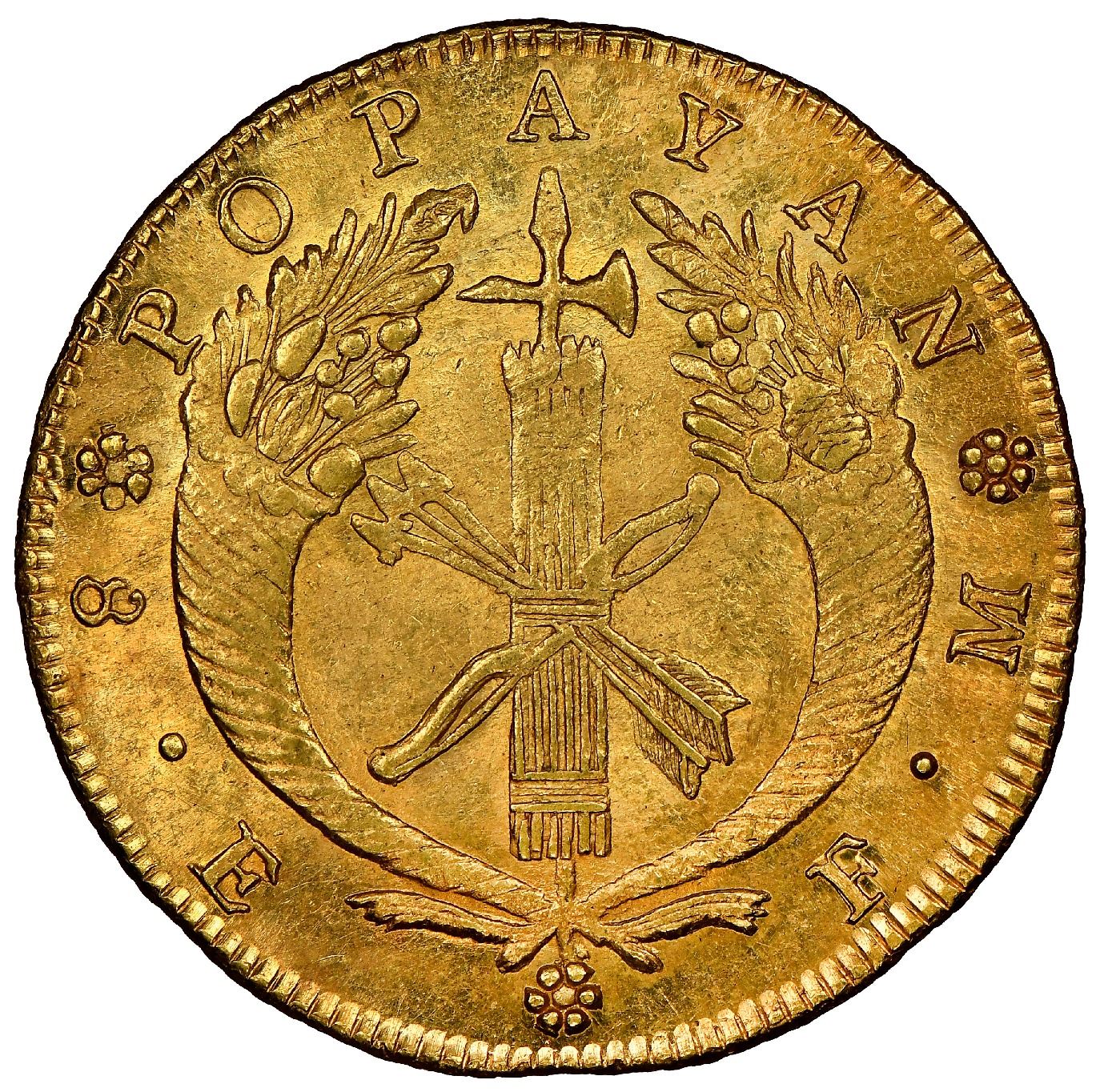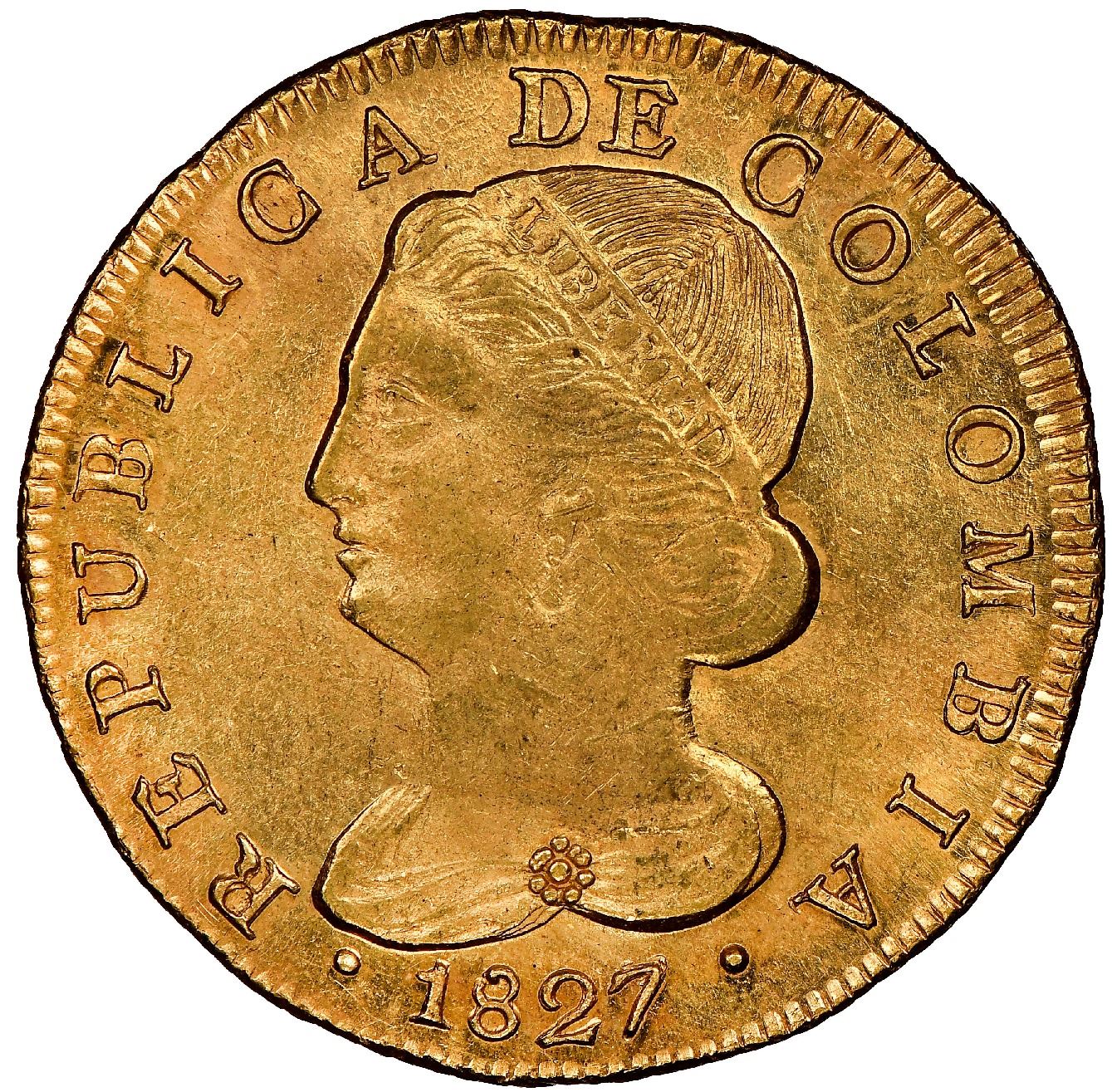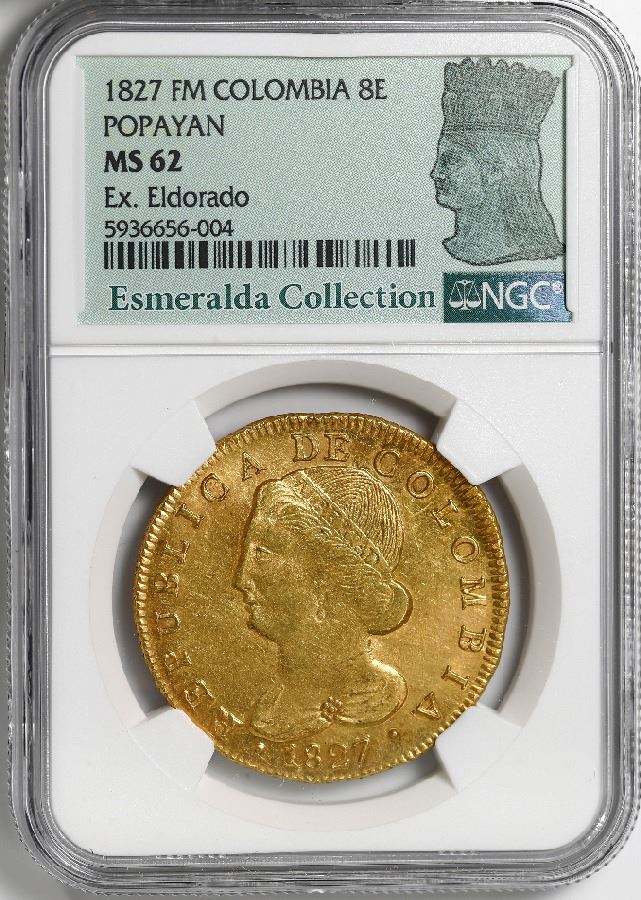 Popayan, Colombia, gold 8 escudos, 1827FM, NGC MS 62 ("top pop"), ex-Eldorado (stated on label). Sed-7; Restrepo-166.13; KM-82.2. Fairly strong strike with small patches of light color over luster, very light high-point wear, tied with two others for finest in NGC census (and with two in the PCGS census, one of which is this coin crossed over), rated as R in Sedwick. NGC #5936656-004. Pedigreed to the Esmeralda Collection (stated on special label) and to the Eldorado Collection (Stack's Bowers auction of January 2018, lot 12118).