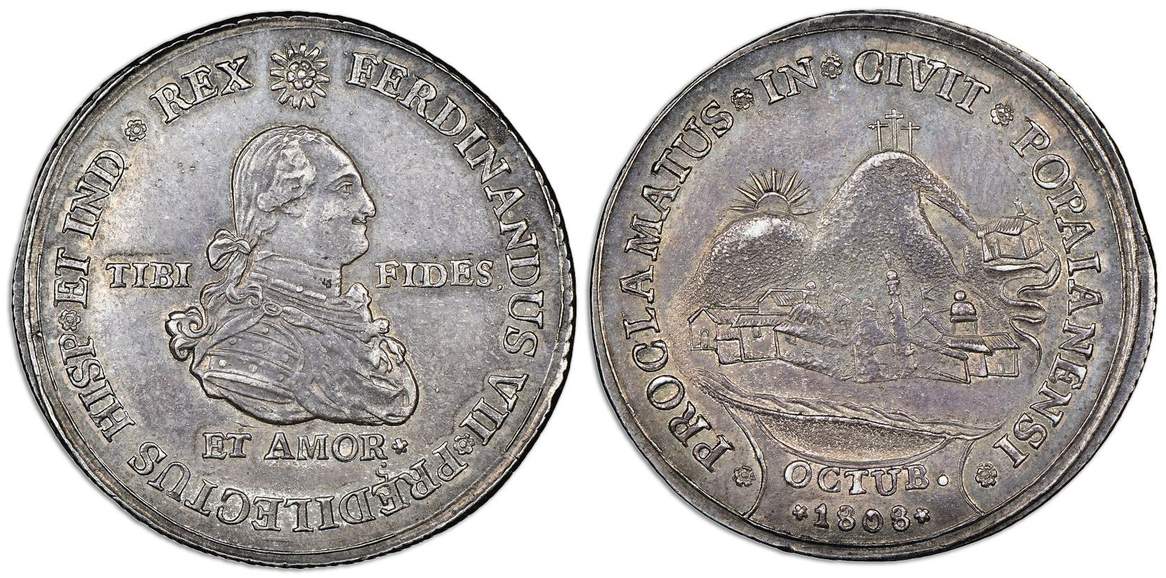 Popayan, Colombia, silver 4R-sized proclamation medal, Ferdinand VII, 1808, NGC AU 53, finest and on