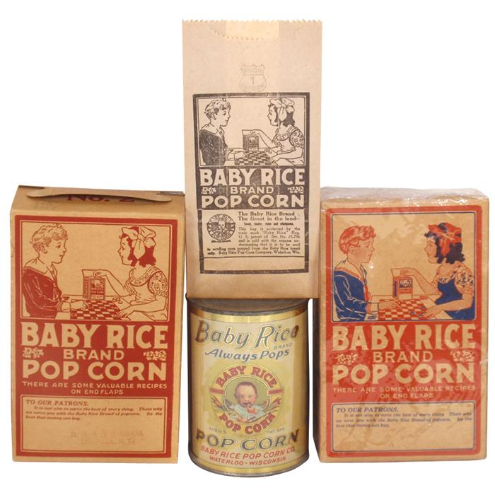 Popcorn items (4), Baby Rice litho on tin, 4.5"H, two Baby Rice boxes (one 2-color & one 3-color), 8