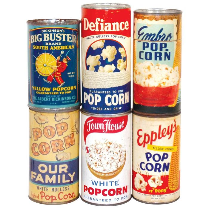 Popcorn tins (6): Eppley's (full), Defiance (full), Our Family (full) & Embro, all w/paper labels.