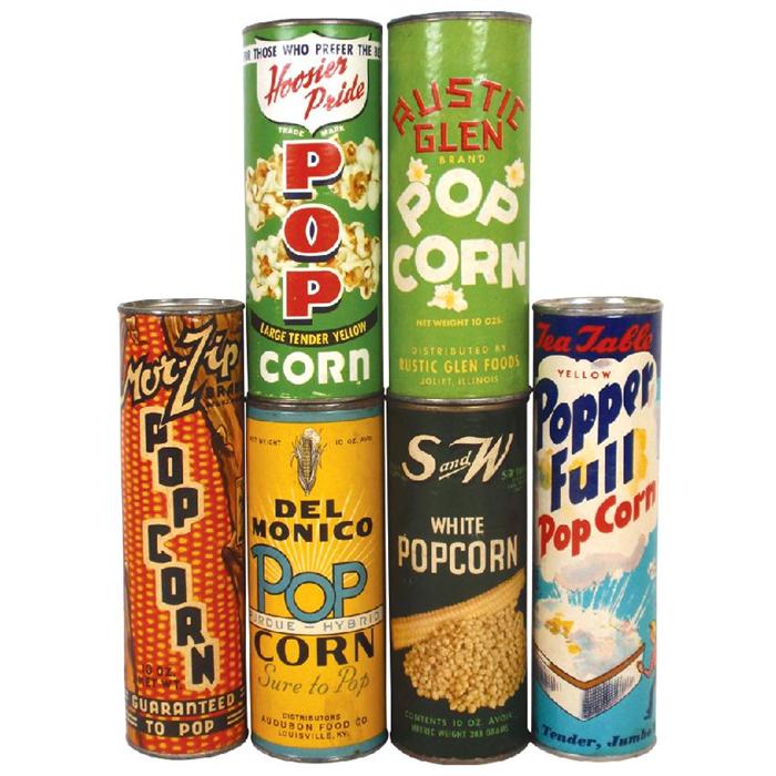Popcorn tins (6), Tea Table (full), Rustic Glen (full), Delmonico (full), Hoosier Pride (full), S and W (full) & Mor-Zip (full), all tubes w/ paper labels, VG & Exc cond, 6-8"H.