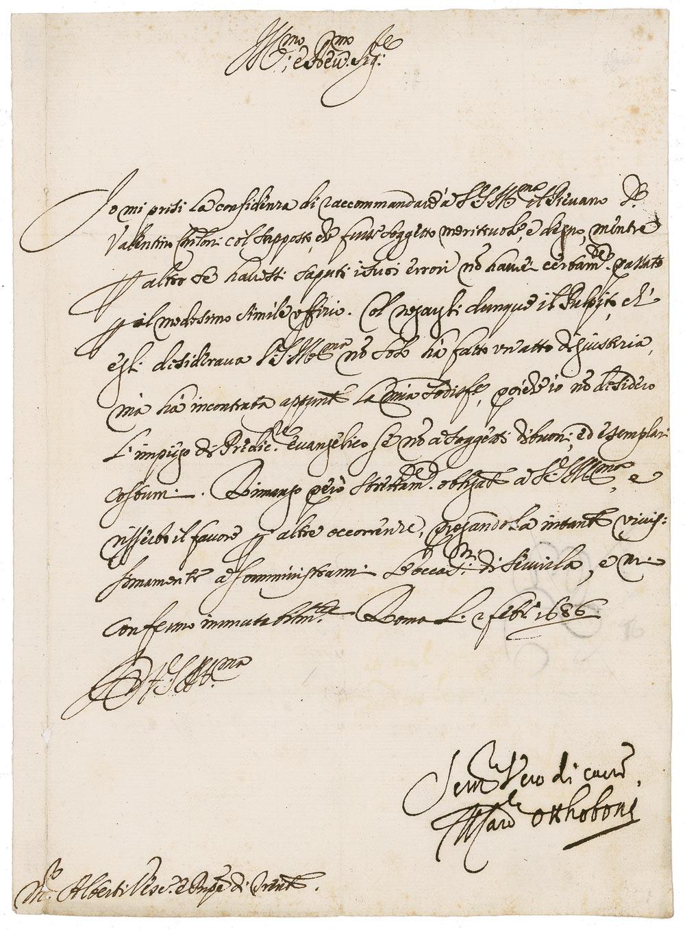 Born Pietro Vito Ottoboni in 1610, he served as Pope from 1689 to 1691. LS in Italian, signed “Il Card Otthoboni,” one page, 8 x 11, February 2, 1686. Letter to Trento Bishop Francesco Alberti regarding the priest Valentino Chiloni, who has been forbidden predication not being of good and exemplar morality. Intersecting folds, three small holes to left edge, a couple small holes of ink erosion, and a bit of scattered light toning and wrinkling, otherwise fine condition. Pre-certified PSA/DNA and RRAuction COA.