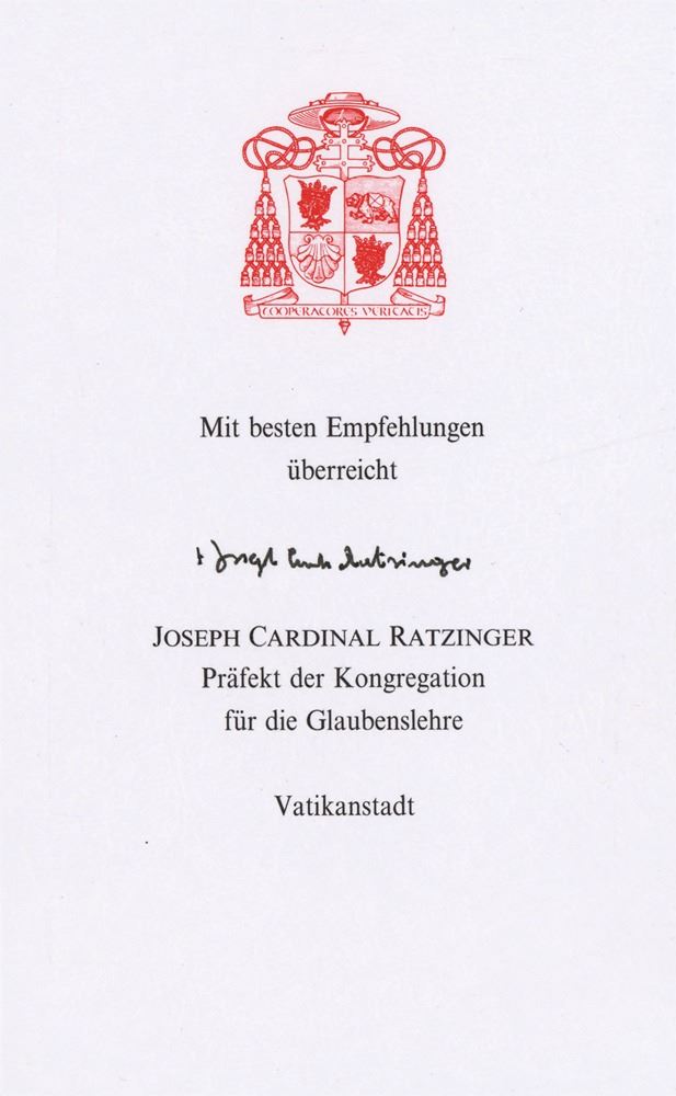 Felt tip signature, "Joseph Card. Ratzinger," on a white 3.5 x 5.75 card imprinted with his coat of arms and a German greeting. In very fine condition. Accompanied by a full letter of authenticity from JSA.