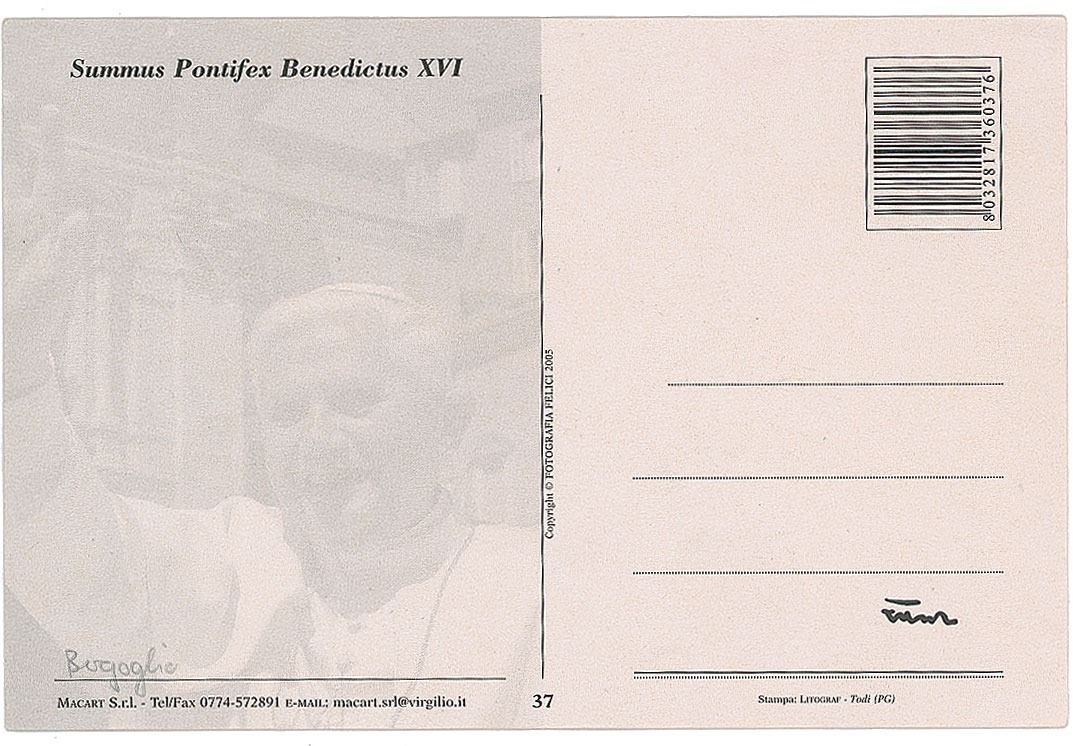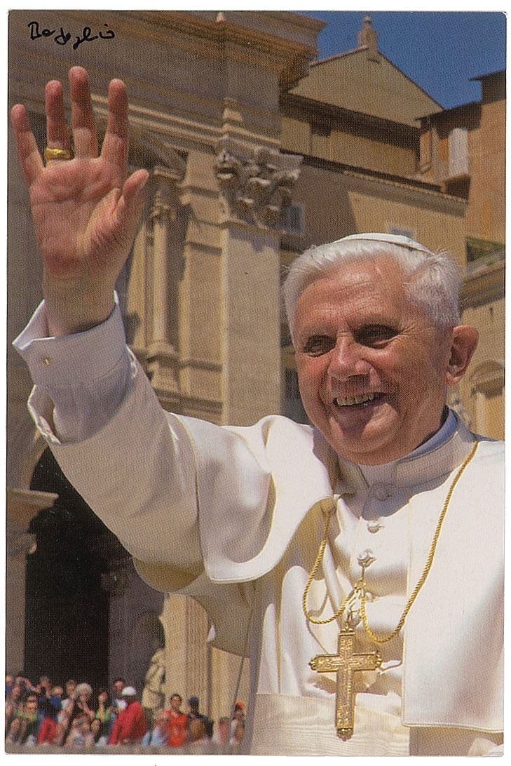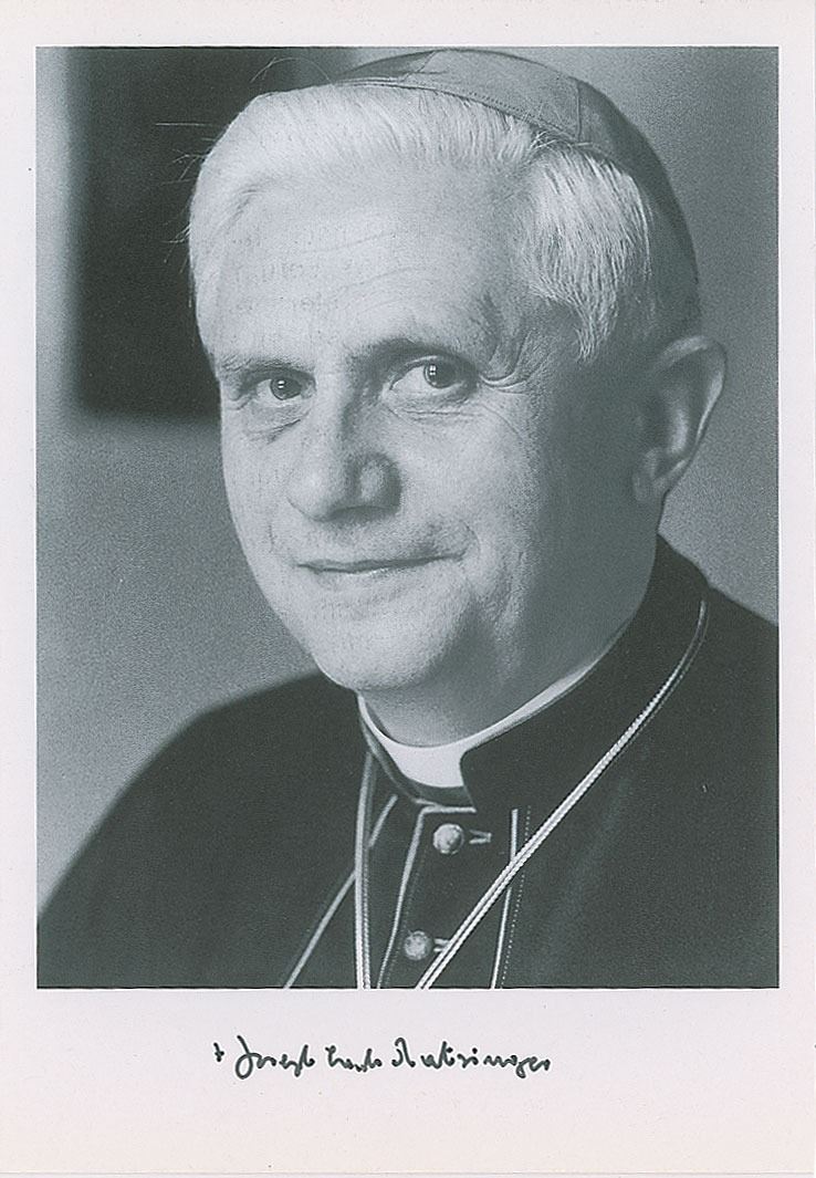 Two items: a semi-glossy 4 x 5.75 cardstock portrait of Pope Benedict XVI as cardinal, signed in the lower border in black ink, "Joseph Card Ratzinger"; and color glossy 4 x 6 postcard of Pope Benedict XVI, signed on the reverse in the lower right corner in black ink by Pope Francis, who signs as Cardinal Bergoglio. In overall fine condition. Accompanied by a mailing envelope, a Christmas card with preprinted signature of Pope Benedict XVI, and a letter of provenance from the original recipient for the Pope Francis signature, which reads, in part: "This picture postcard which displays Pope Benedict XVI, on the reverse contains on the lower right corner an authentic signature of Cardinal Bergoglio…[who] signed this postcard in person at the occasion of the March 2006 cardinal creating consistory on St. Peter's square in Rome."